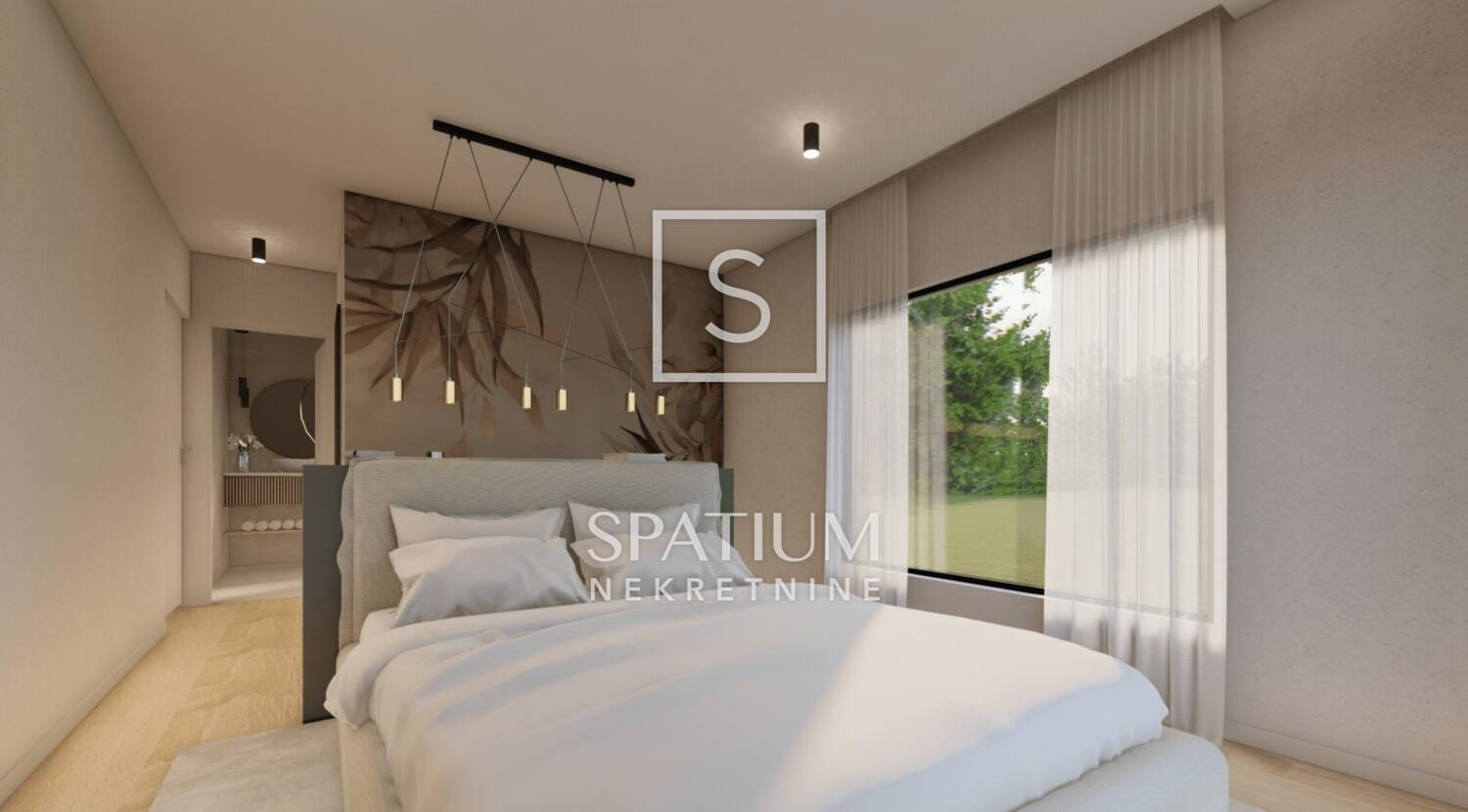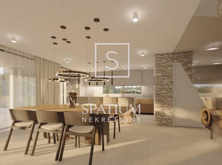 U prizemlju se nalazi elegantan ulazni prostor s garderobom, gostinjskim WC-om, tehničkom prostorijom te unutarnjim stepeništem. Središnji dio prizemlja čini veliki otvoreni prostor s kuhinjom i blagovaonicom te prostranim dnevnim boravkom koji, zahvaljujući velikim staklenim stijenkama, pruža obilje svjetla i povezuje interijer s eksterijerom. Iz dnevnog prostora izlazi se na natkrivenu terasu i vanjsku kuhinju, idealnu za ljetna druženja, a u sklopu okućnice smješten je bazen od 30 m² sa sunčalištem.