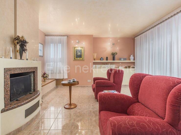 Kuća je Površine 420m2 koji se protežu na tri etaže. Nešto posebno i vrijedno nalazi se u podrumu kuće, tradicionalna istarska konoba u kojoj se nalazi mini kameni bar, velika blagovaona sa kaminom, opremljena kuhinja, toalet i vinski podrum u staklu. Konoba je povezana sa ostalim dijelom kuće te se tako stepenicama odlazi u prizemlje kuće. Sastoji se od dvije spavaće sobe i dvije kupaone sa tuš kabinama, prostrani dnevni boravak sa kaminom koji ima izlaz na zimski vrt i na dvorište kuće, u nastavku je blagovaona i kuhinja sa spremištem. Na prvome katu našle su se još tri spavaće sobe, jedna master sa izlazom na balkon koja ima vlastitu raskošnu kupaonu sa kadom i tuš kabinom i walk in closet. U hodniku kata se nalazi dodatan dnevni prostor koji može služiti kao radni prostor, mini teretana sa izlazom na balkon. Na ulazu u drugu kupaonu smjestila se prostorija cijela opremljena ugradbenim ormarima što čini dodatan prostor za odlaganje. Sve prostorije i spavaće sobe su klimatizirane, a grijanje je centralno na naftu te podno grijanje izuzev u spavaćim sobama. Spremište se nalazi u podrumu kuće.