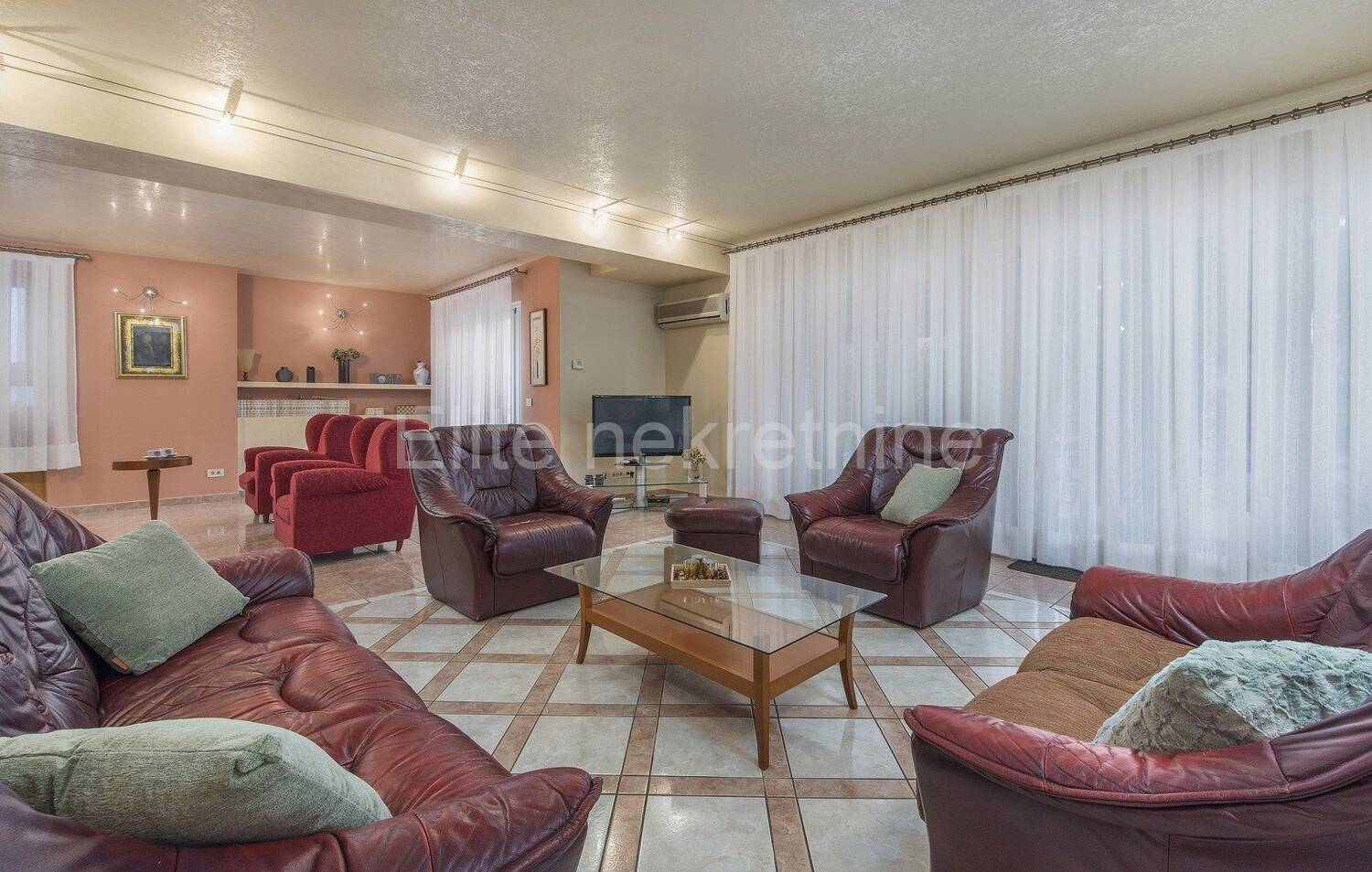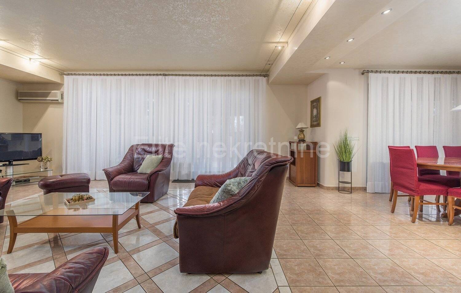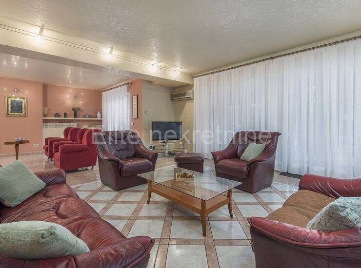 Iz prizemlja se izlazi na veliku natkrivenu terasu, dvorište od cca 1350m2( na jednom dijelu se može još graditi), sunčalište i prekrasan bazen od 77m2.