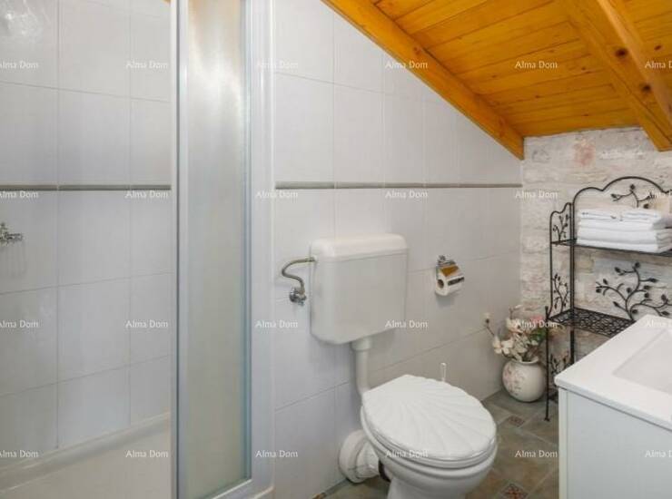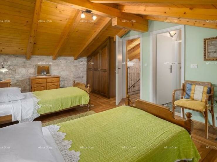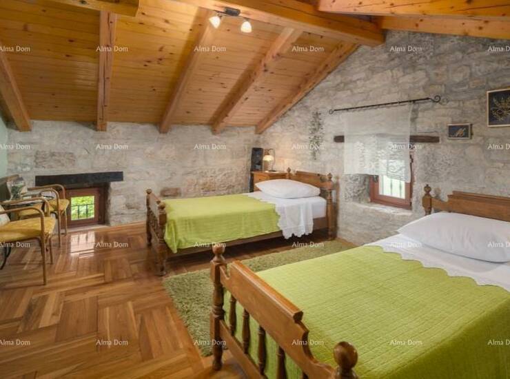 Prodaje se kuća za odmor Tinjan. Ova kuća je idealna prilika jer od 2008. ima uhodanu djelatnost sezonskog iznajmljivanja turistima. Stambena površina ove tipične istarske kamene kuće iznosi 193,47m2, a uz nju se prodaju poljoprivredni i urbanizirani tereni s ukupnom površinom od ukupno 6.253m2. U prizemlju se nalazi dnevni boravak, kuhinja, te blagovaona, a u sklopu kuće s vanjske strane je i vanjska kupaonica. Prvi kat ima dvije spavaće sobe s pripadajućim kupaonicama. U potkrovlju se nalaze još dvije spavaće sobe, također svaka sa svojom kupaonicom. Uz kuću se nalazi bazen od 32m2 i hidromasažna kada za 6 osoba. S vanjske strane kuće je natkrivena terasa, spremište za bicikle i ostava, te zidani roštilj. U dvorištu kuće je voćnjak sa dječjim igralištem, koje ima tobogan, ljuljačke, nogometne golove i trampolin. U neposrednoj blizini kuće nalazi se manji objekt od 32m2 u kome je sadržaj za zabavu (pikado, bilijar, stolni nogomet). Cijeli teren kuće ograđen je zidom.