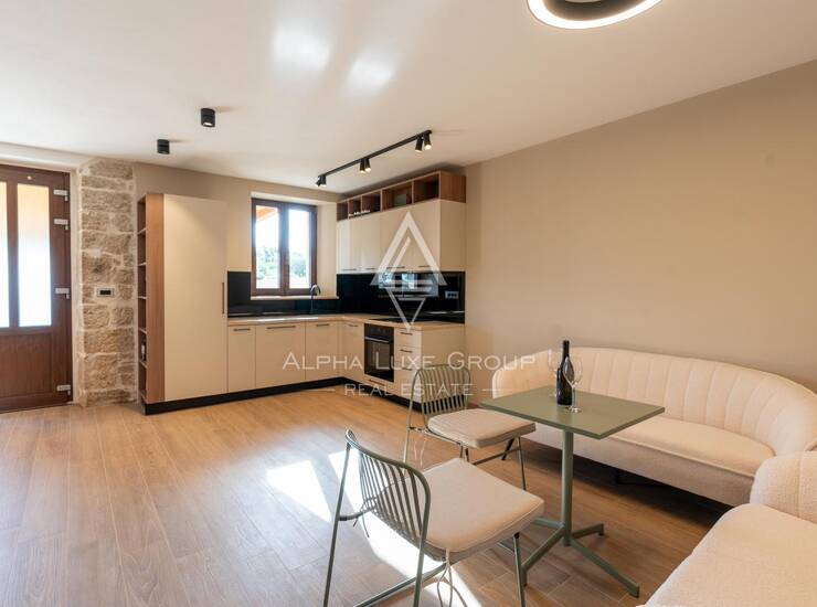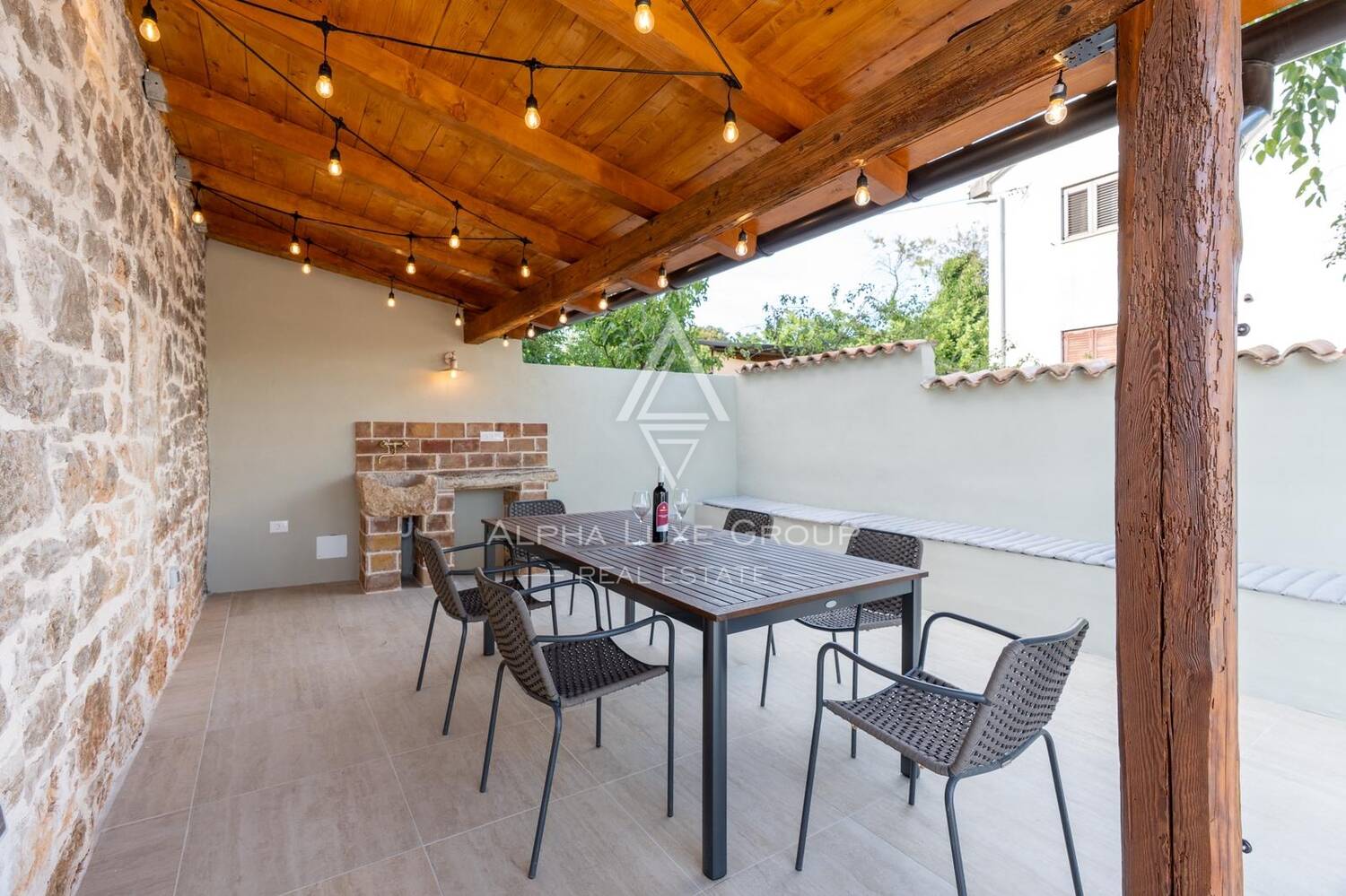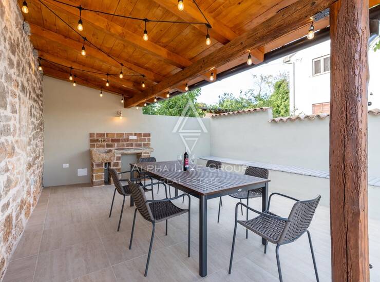 Kuća je upravo kompletno adaptirana, pri čemu je vlasnik pažljivo birao samo najkvalitetnije materijale. Prostire se na 137,58 m², raspoređenih na tri etaže povezane elegantnim unutarnjim stepeništem sa staklenom stijenom koja unosi dodatnu svjetlost i naglašava spoj modernog dizajna i tradicionalnih kamenih zidova.