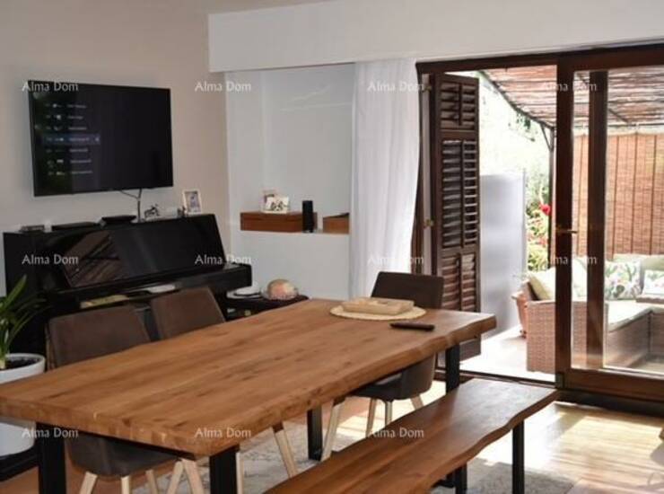 Na prvom katu se nalazi dnevni boravak, velika terasa, dvije spaavaće sobe od kojih jedna ima garderobu i kupaonu i još jedne kupaone.