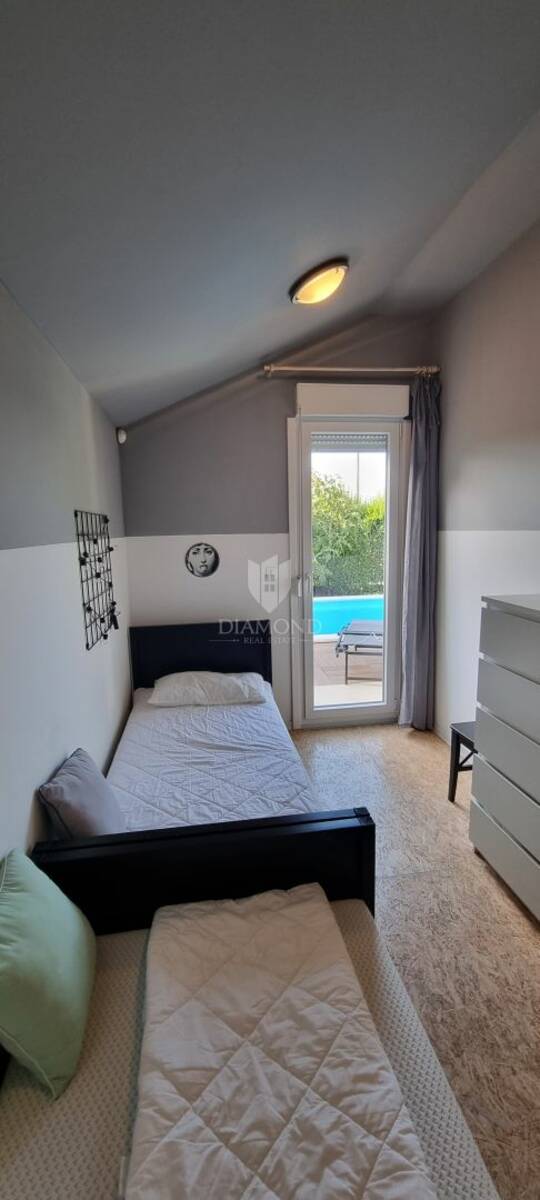 Kuća se sastoji od prostranog dnevnog boravka s kuhinjom i blagovaonicom, tri spavaće sobe, dvije kupaonice i ostave, a iz dnevnog dijela izlazi se na natkrivenu terasu, sunčalište i bazen.