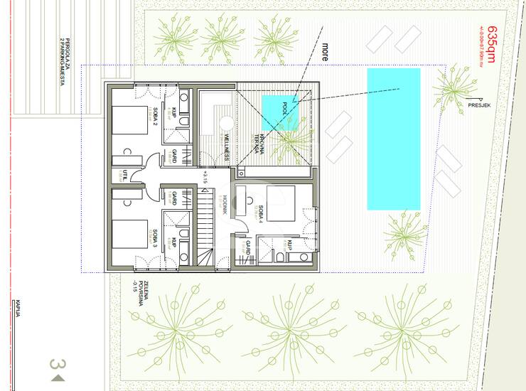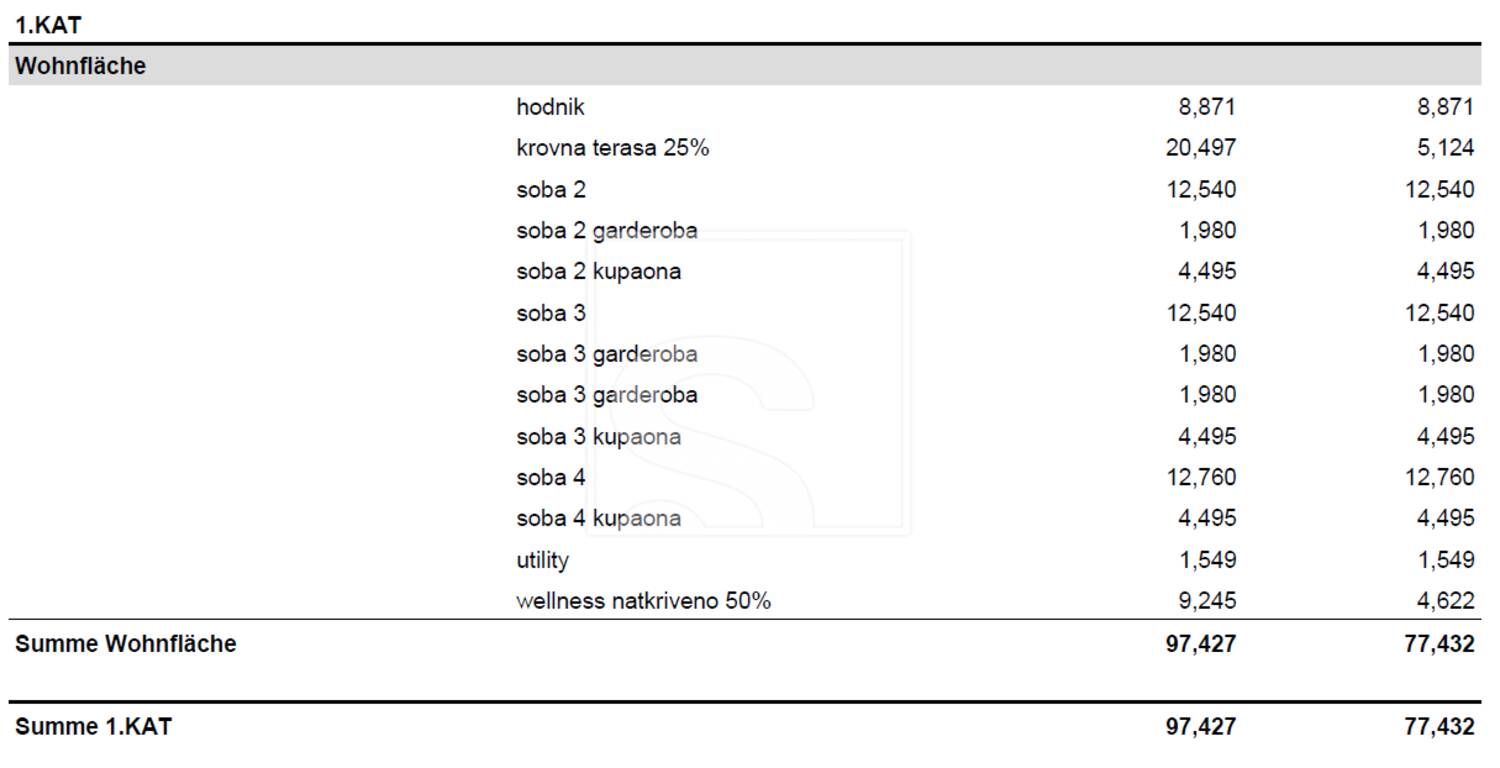 Vile su osmišljene i projektirane kao moderne katnice te su sve istih površina, odnosno kvadratura. Sastoje se od prizemlja u kojem se nalazi hodnik, garderoba, tehnička soba, gostinjski wc, prostrani dnevni boravak s izlazom na natkrivenu terasu, kuhinja sa blagovaonicom te jedna spavaća soba s vlastitom garderobom i kupaonicom. Na katu se pristupa unutarnjim stepeništem te se nalazi prostrani hodnik koji spaja tri lijepe i komforne spavaće sobe od koje dvije imaju vlastitu garderobu i kupaonicu a jedna samo kupaonicu, na katu se nalazi još utility room te Wellness na natkrivenoj terasi.