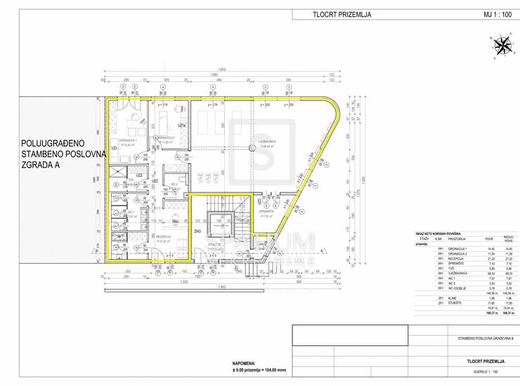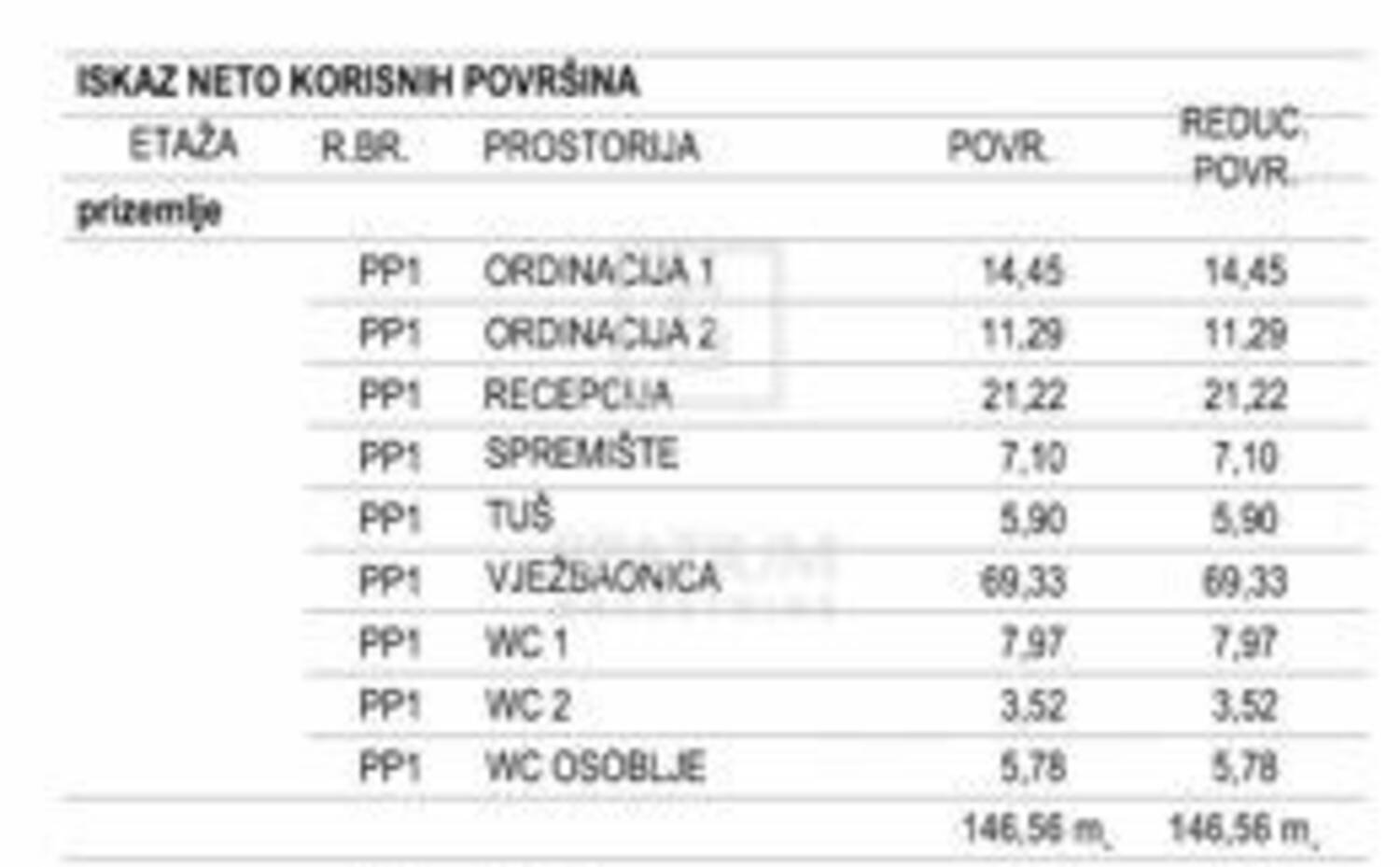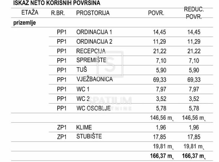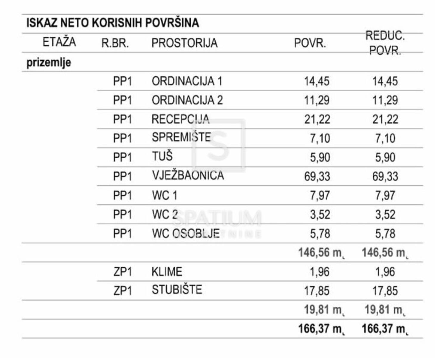 Prostor uključuje recepciju, dvije ordinacije, vježbaonicu, tuš, garderobu, spremište, sanitarne čvorove (uključujući WC osoblja), što ga čini idealnim za fizioterapijsku ordinaciju, polikliniku, rehabilitacijski centar, wellness, fitness studio manjeg obujma, kozmetički salon ili uredske prostore za srodne djelatnosti.