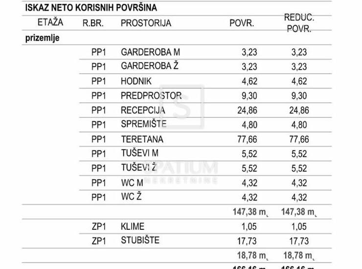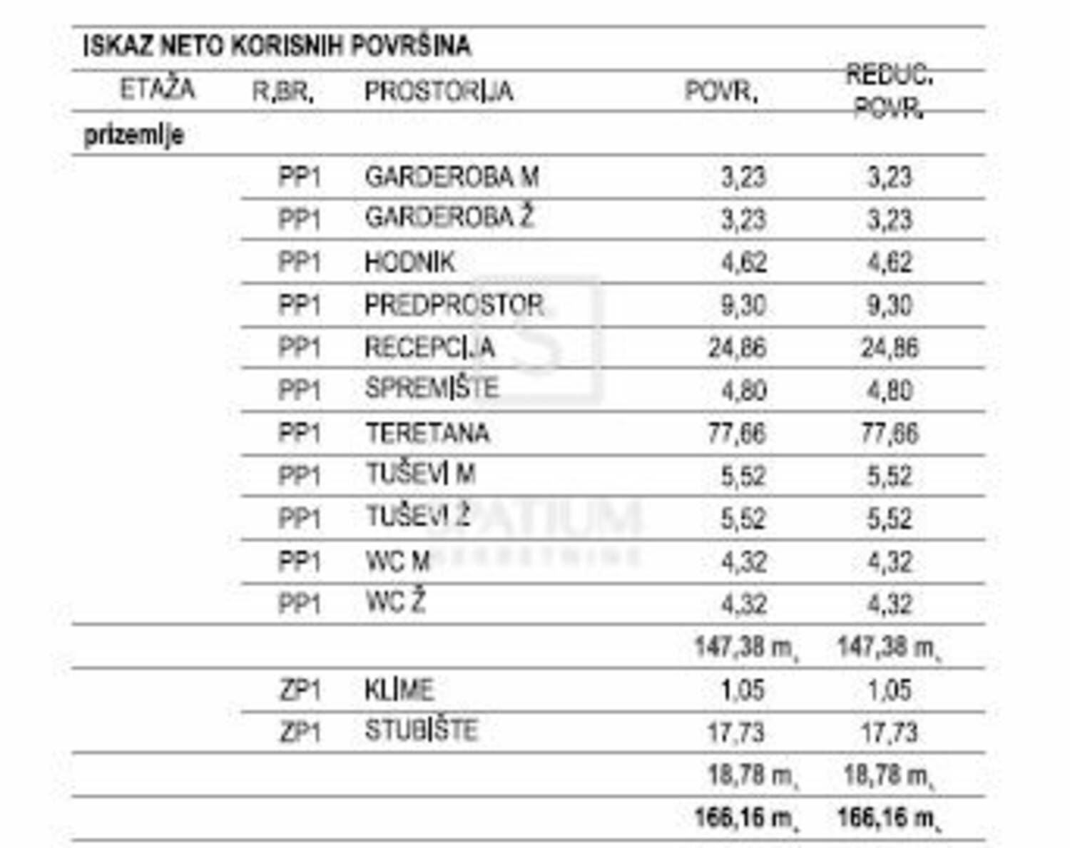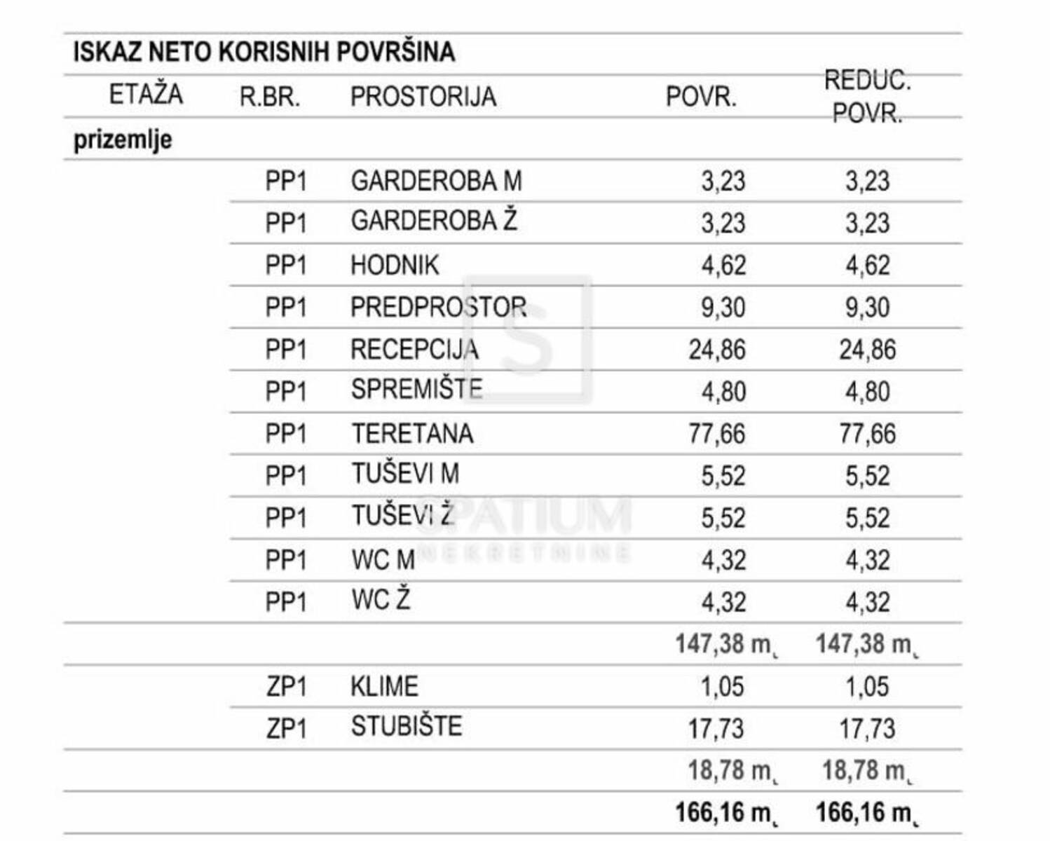 Prostor uključuje recepciju, hodnik, svlačionice za muškarce i žene, sanitarne čvorove, spremište, teretanu te prateće pomoćne prostorije. Idealan je za fitness centar, wellness, ordinaciju, salon ljepote, uredske prostore ili druge uslužne djelatnosti.