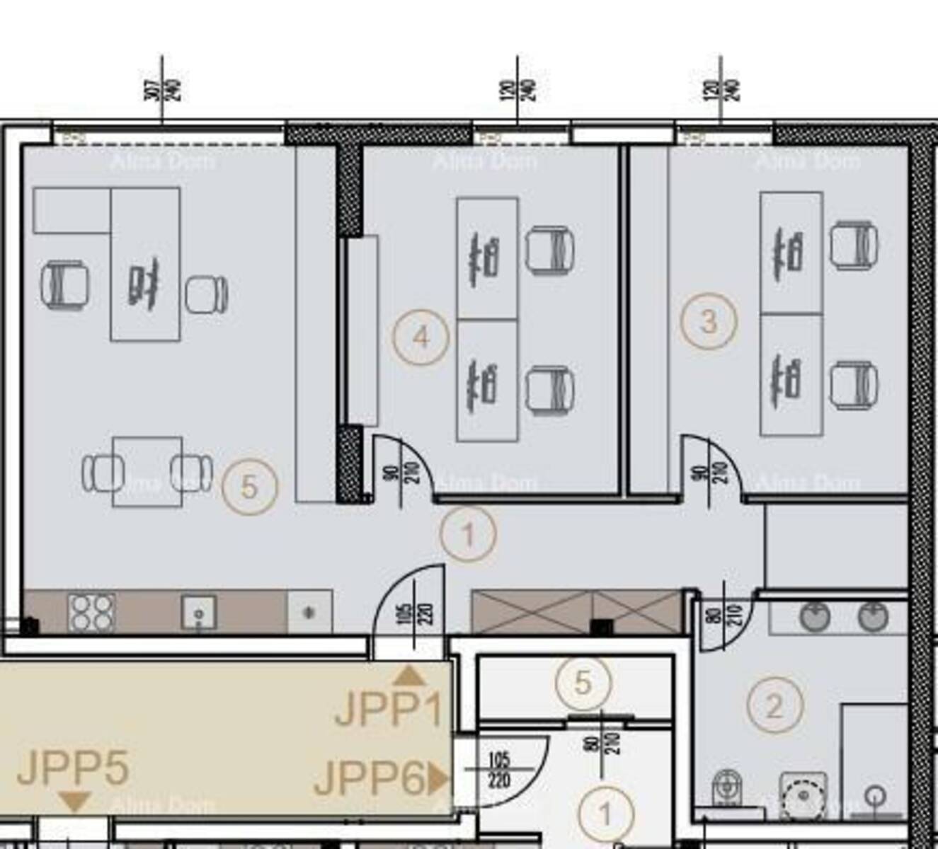 Poslovni prostor JPP1, nalazi se u prizemlju južnog dijela i sastoji se od ulaznog prostora, kupaone, 2 ureda i čajne kuhinje.
