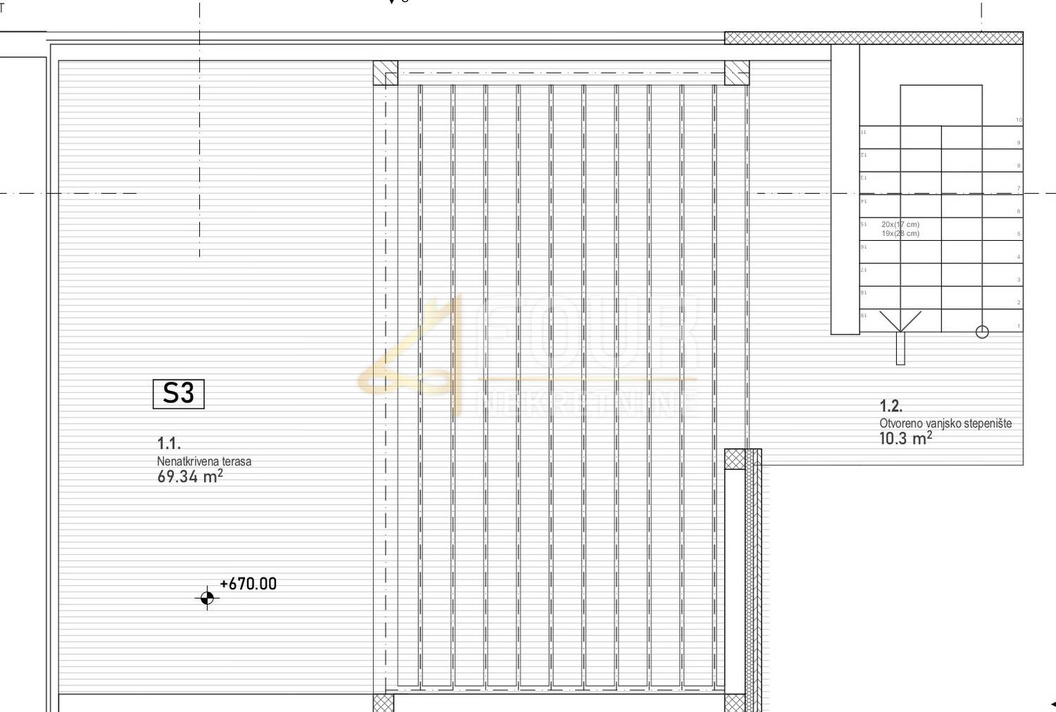 Stan se sastoji od dvije spavaće sobe, prostranog dnevnog boravka, kuhinje s blagovaonicom, dvije kupaonice, degažmana te natkrivene terase, koja je savršeno mjesto za uživanje u vanjskom prostoru. Dodatno, stan nudi impresivnu krovnu terasu površine 69.34m2 koja pruža nevjerojatan pogled na more i okolnu prirodu – idealna za opuštanje i zabavu.