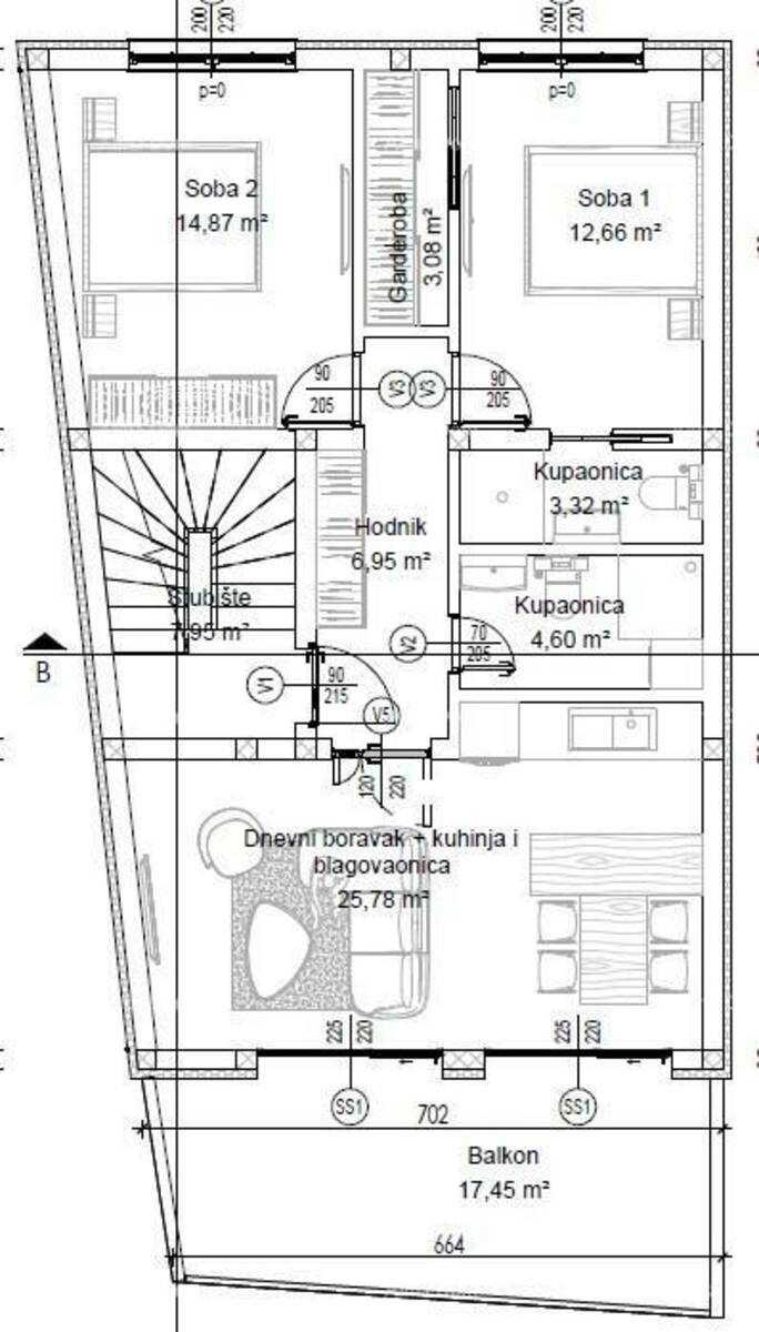 Stan 2 s površinom od 84.35 m² pruža idealan prostor za život. Stan je smješten na drugom i trećem katu zgrade s tri kata, i sastoji se od hodnika, 2 spavaće sobe, garderobe, 2 kupaone, dnevnog boravka s kuhinjom i blagovaonom i velikog balkona od 17.45m2 (13.09 m2) na drugom katu i od zatvorenog krovnog prostora 42.23 m2, nenatkrivene krovne terase 50.67 m2 na trećem katu.