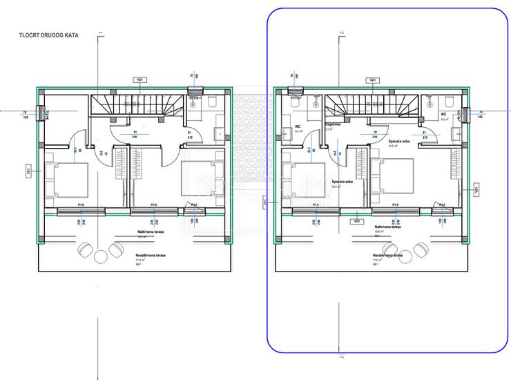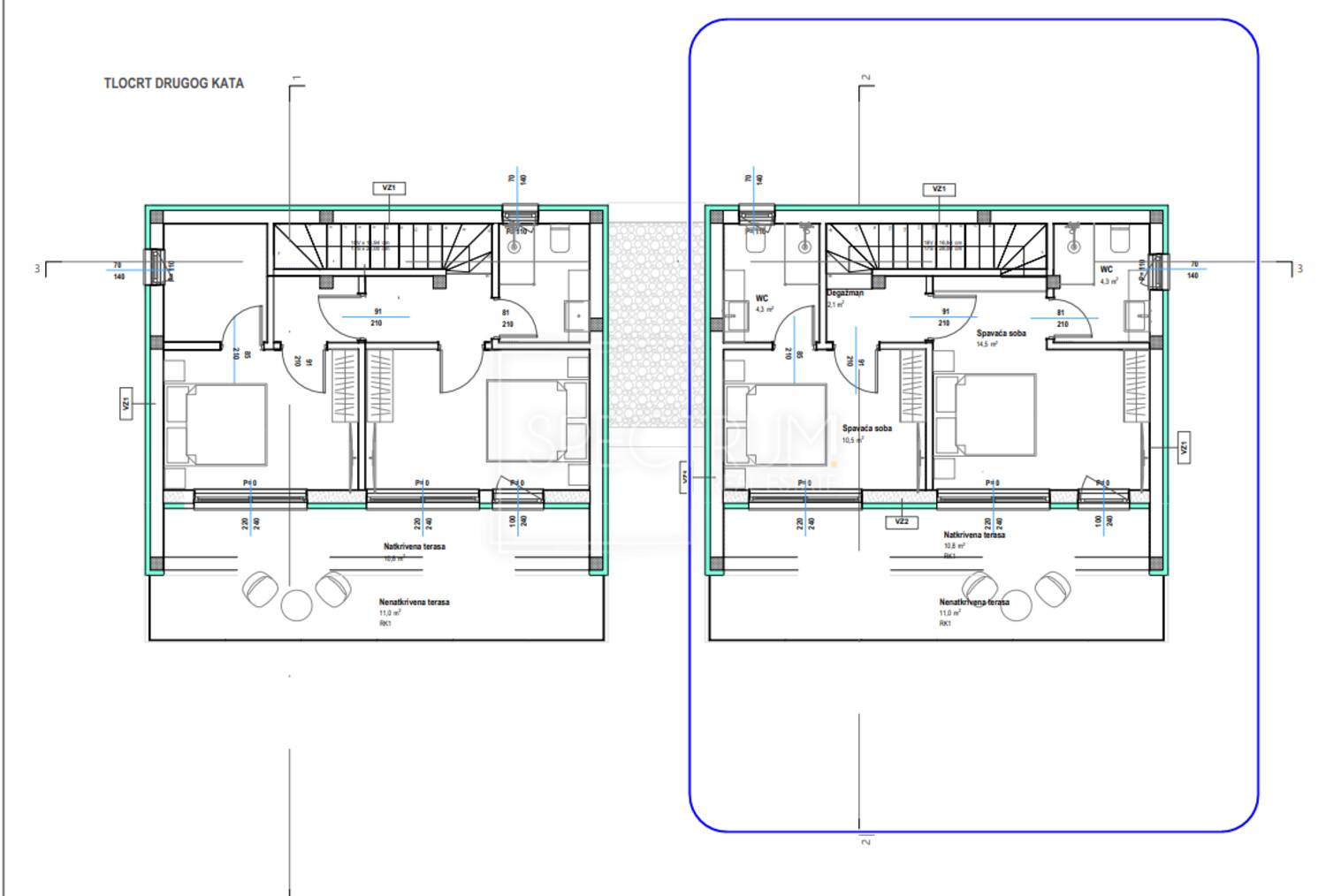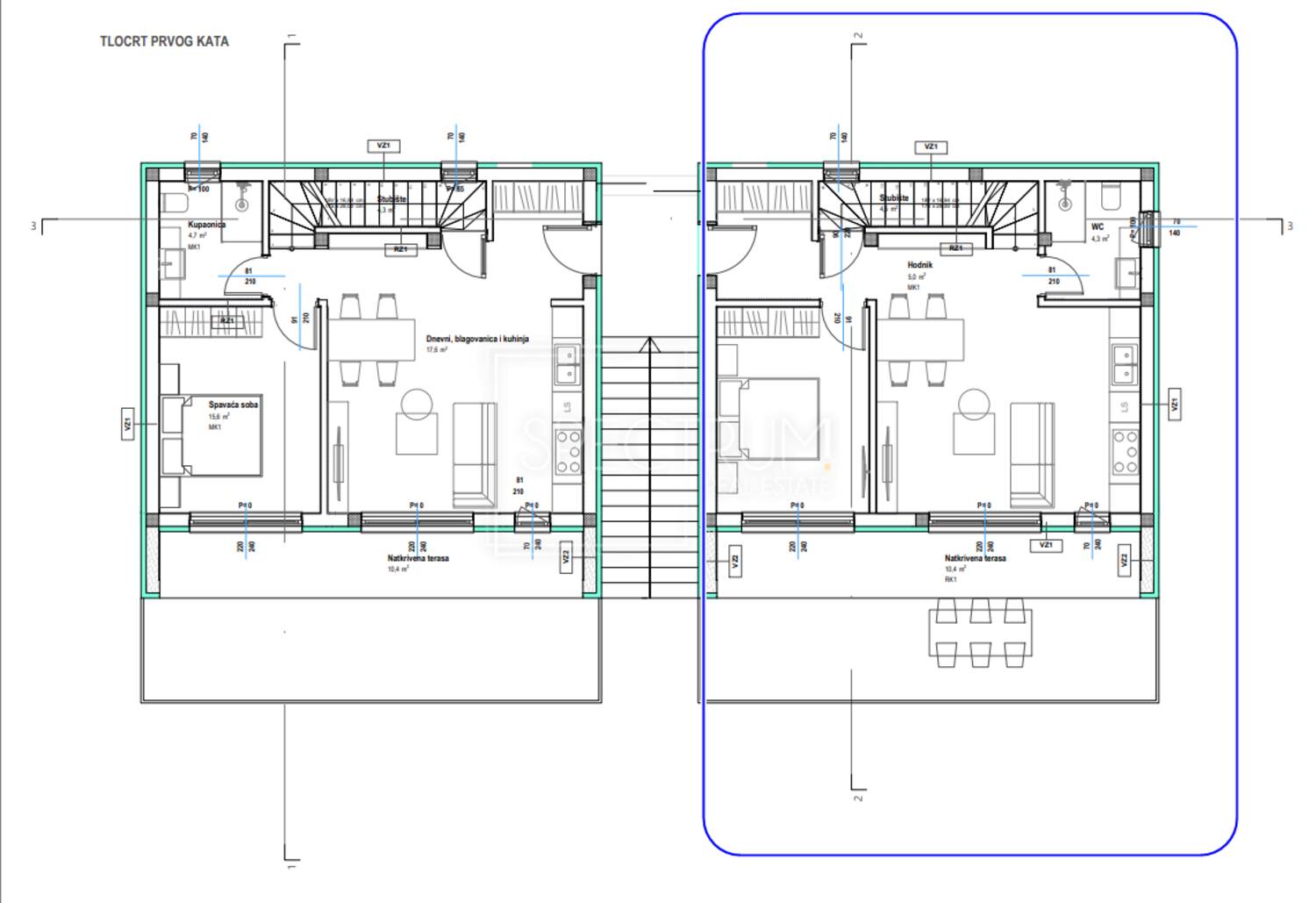 Stan se nalazi u manjoj stambenoj zgradi sa 4 stambene jedinice. Stan se proteže na 1.kat i 2.kat. Površina stana iznosi 89 m2. Na 1.katu se nalazi dnevni boravak sa kuhinjom i blagovaonicom open space koncepta, spavaća soba i kupaonica. Unutarnjim stepenicama dolazi se do 2.kata gdje se nalazi hodnik, 2 spavaće sobe, 2 kupaonice te prostrana terasa sa koje se pruža predivan pogled na more i na lijepi krajolik. Grijanje je regulirano putem podnog grijanja i klima uređaja. Stan se prodaje u fazi ključ u ruke (završeni podovi i sanitarije, bez namještaja). U gradnji su korišteni vrlo kvalitetni materijali. Stan karakteriziraju velike staklene stijene koje omogućavaju veliku dozu prirodne svjetlosti i stvaraju dojam otvorenosti prostora. U vlasništvu stana su i 2 parkirna mjesta.