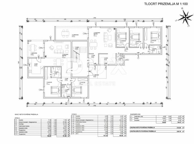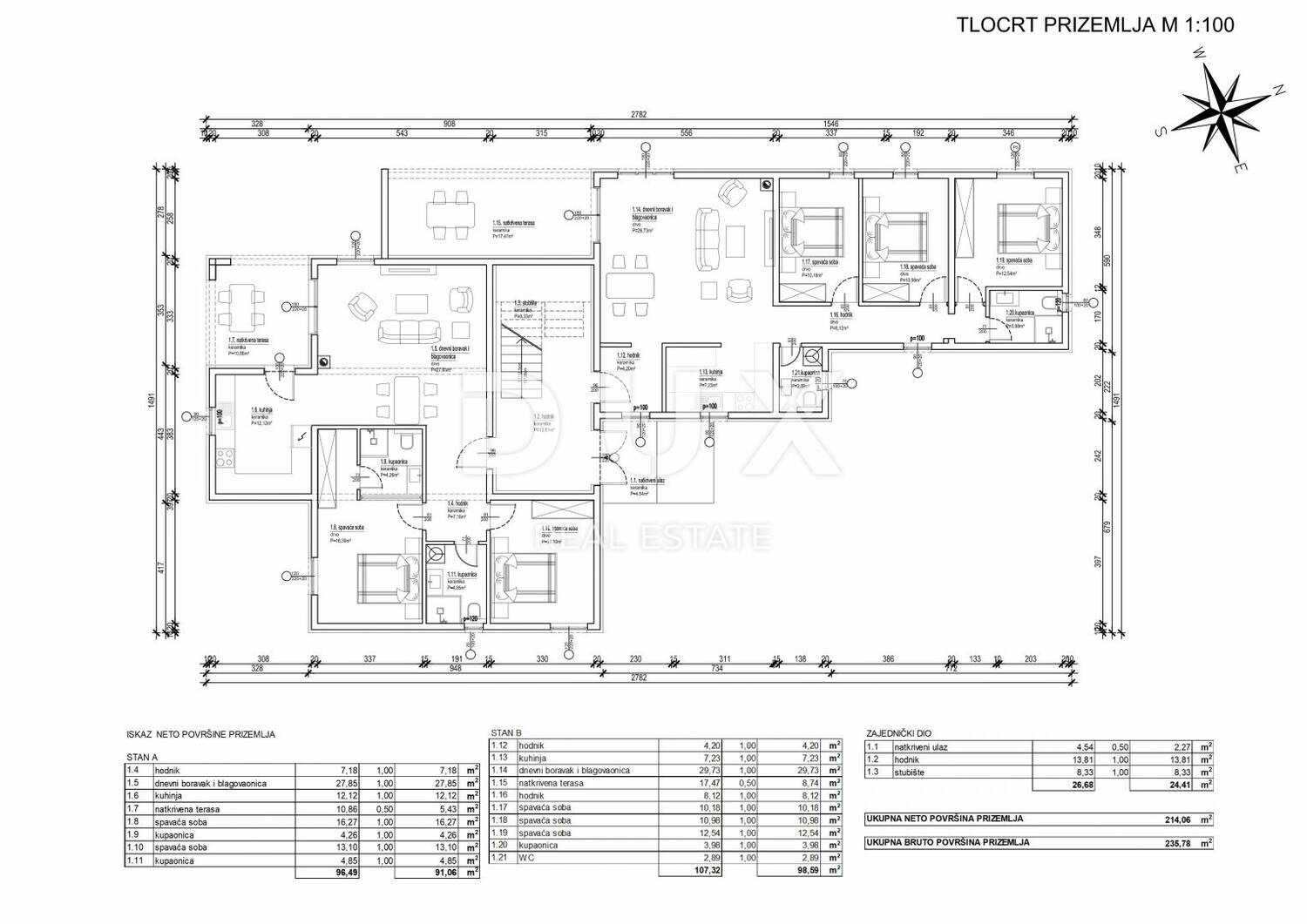 Stan B, smješten u prizemlju, prostire se na ukupnoj površini od 98,59 m2. Sastoji se od hodnika, wc-a za goste, kupaone, tri spavaće sobe, kuhinje te dnevnog boravka s blagovaonom. Iz dnevnog boravka vodi i