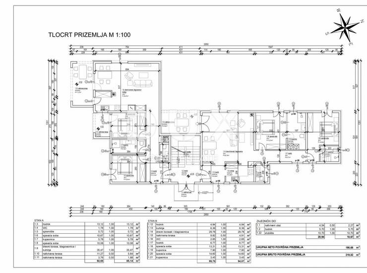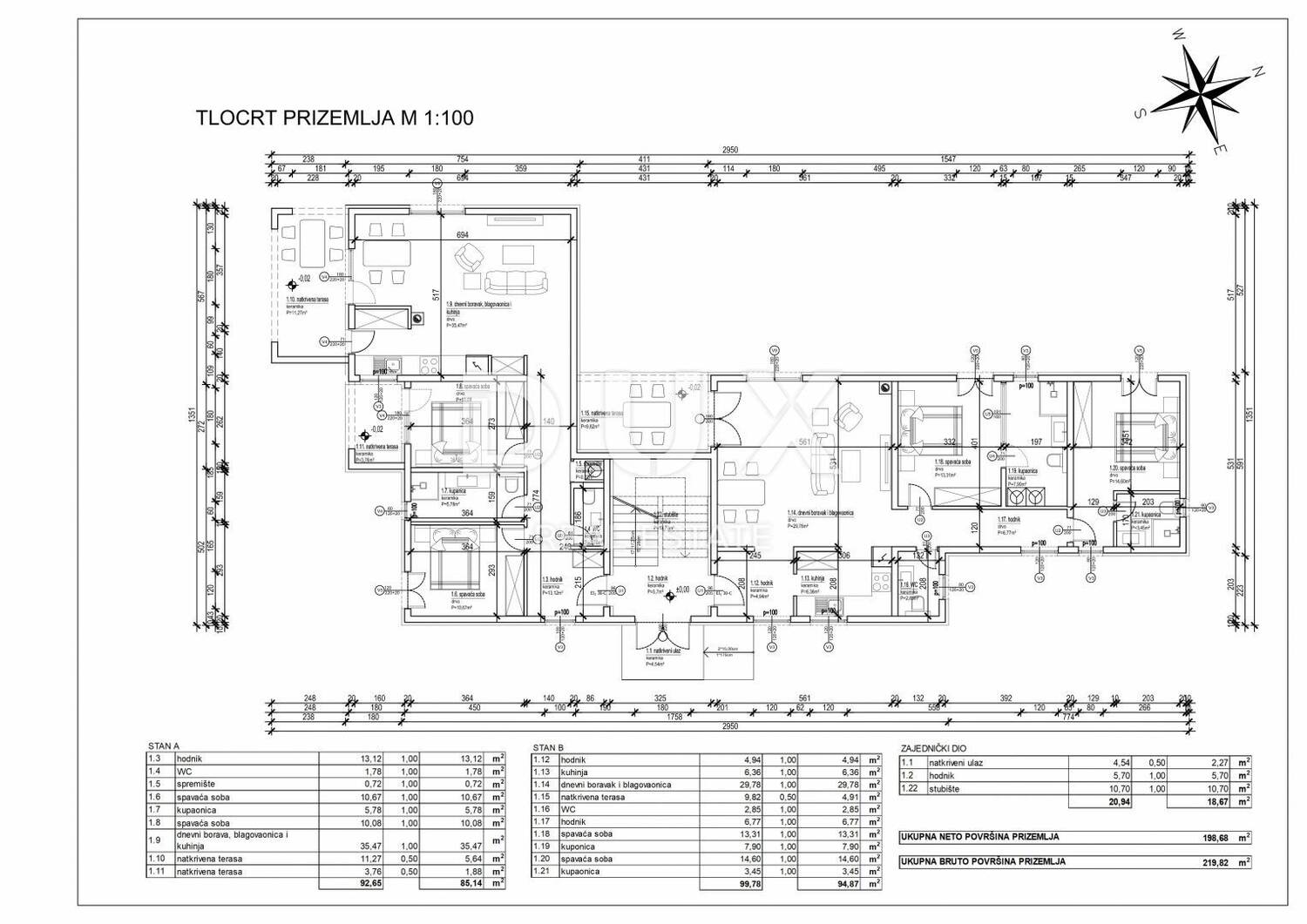 Stan B, smješten u prizemlju, prostire se na ukupnoj površini od 94,87 m2. Sastoji se od hodnika, wc-a za goste, dvije prostrane spavaće sobe te svaka ima svoju privatnu kupaonu, kuhinje te dnevnog boravka s