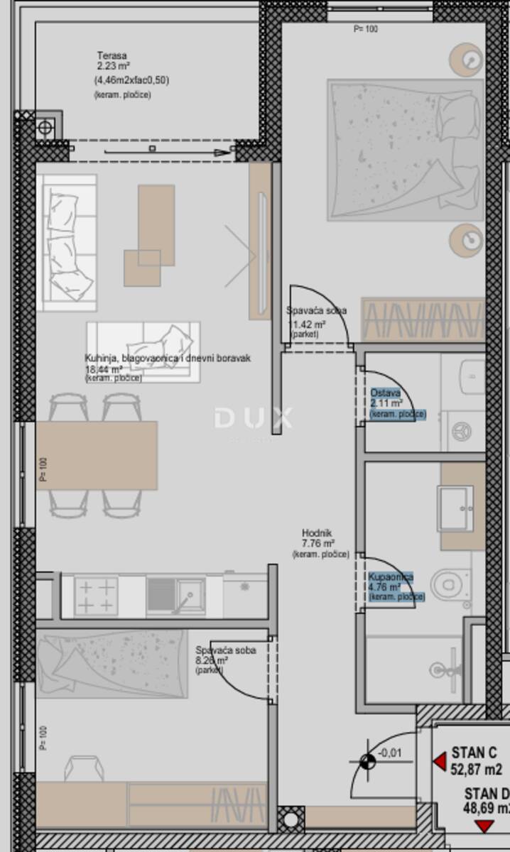 Predmetni stan je stan C u prizemlju zgrade koji nudi stambenu površinu od 52,87 m2 te parkirno mjesto uz nadoplatu ovisi koji tip parkinga odaberete.