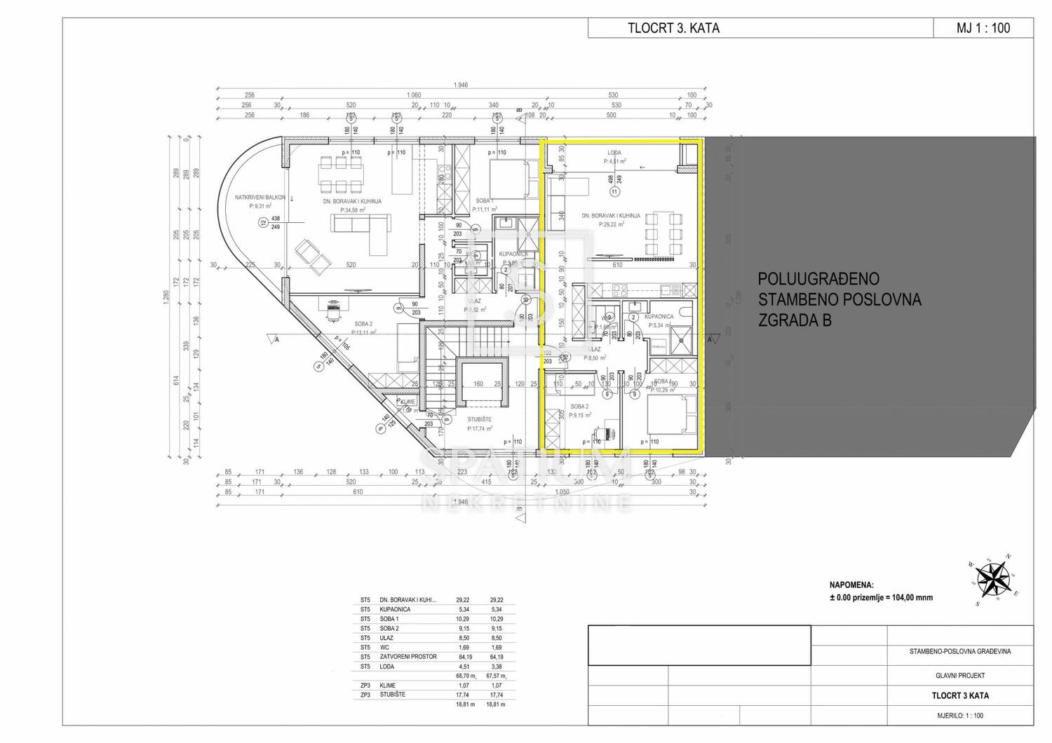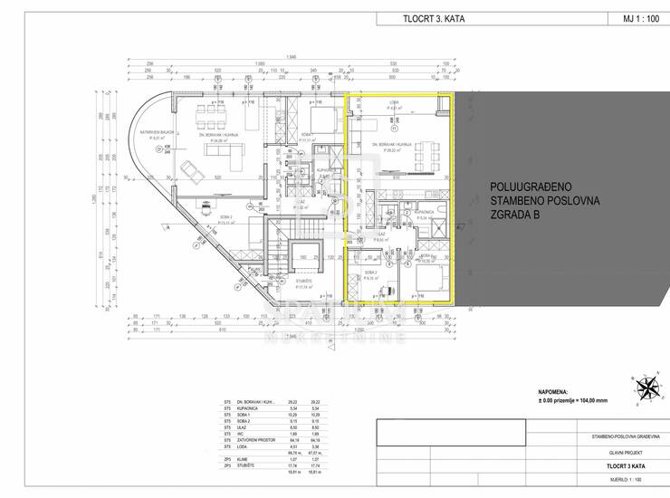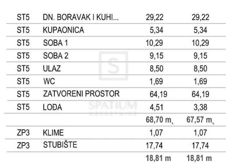 Stan se prostire na ukupno 68,70 m², odnosno 67,57 m² obračunske površine, a sastoji se od prostranog dnevnog boravka s kuhinjom i blagovaonicom, dvije spavaće sobe, kupaonice, zasebnog WC-a, ulaznog prostora te lođe od 4,51 m² koja dodatno obogaćuje stambeni prostor i nudi mogućnost opuštanja na otvorenom.