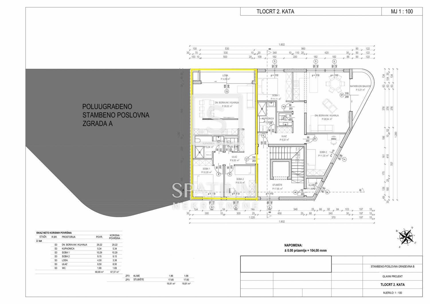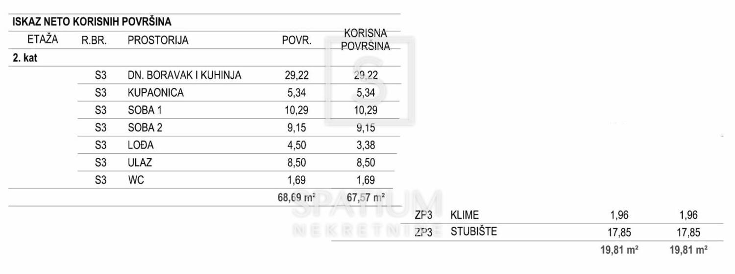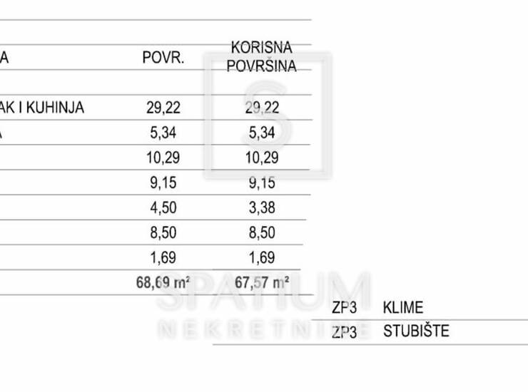 Stan se prostire na ukupno 68,69 m², odnosno 67,57 m² obračunske površine, a sastoji se od prostranog dnevnog boravka s kuhinjom i blagovaonicom, dvije udobne spavaće sobe, kupaonice, zasebnog WC-a te ulaznog dijela. Dodatnu vrijednost pruža natkrivena lođa od 4,50 m², savršena za opuštanje i uživanje u pogledu na more.