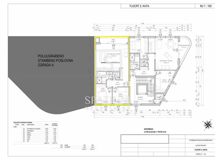 Zgrada u kojoj se stan nalazi sastoji se od ukupno 12 stambenih jedinica i 2 poslovna prostora, izvedena u armiranobetonskoj konstrukciji s vrhunskom toplinskom i zvučnom izolacijom. Stanovi su projektirani prema najvišim standardima modernog stanovanja – u svim prostorijama predviđeno je podno grijanje i klimatizacija, dok video-portafon i protuprovalna vrata osiguravaju dodatnu sigurnost. Vanjska PVC stolarija s troslojnim IZO staklom, kamenim klupčicama i mogućnošću ugradnje komarnika garantira energetsku učinkovitost i dugotrajnost. Završne obloge uključuju keramiku prve klase renomiranih proizvođača, uz mogućnost izbora materijala prema želji kupaca.