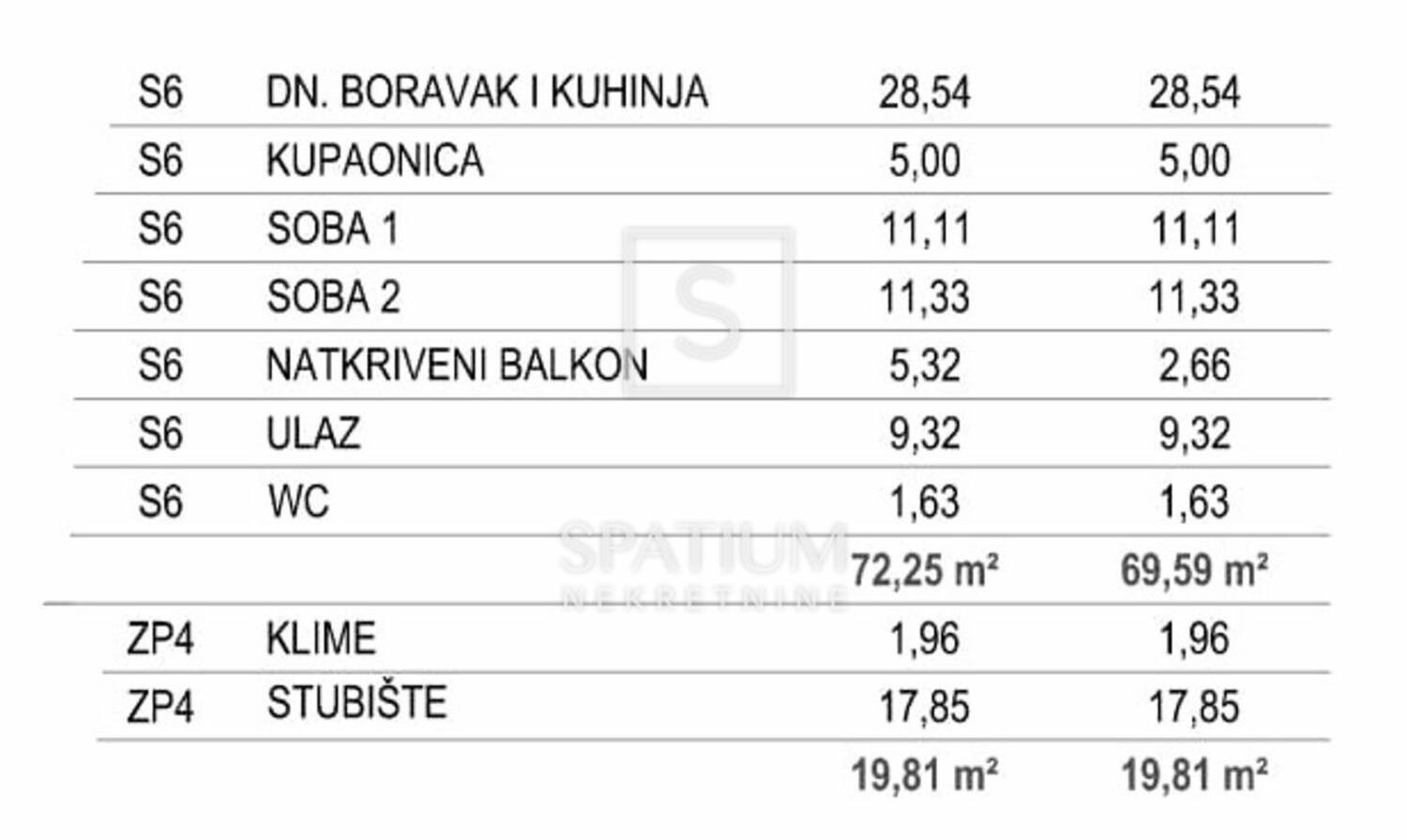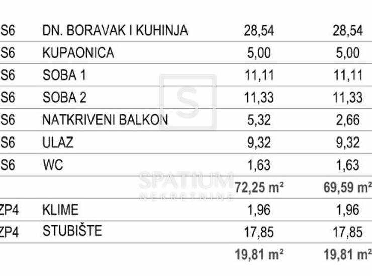 Stan se prostire na ukupno 72,24 m², odnosno 69,59 m² obračunske površine, a sastoji se od prostranog dnevnog boravka s kuhinjom i blagovaonicom, dvije udobne spavaće sobe, kupaonice, zasebnog WC-a te ulaznog dijela. Umjesto lođe, stan ima natkrivenu terasu površine 5,31 m², idealnu za opuštanje i uživanje na otvorenom uz pogled na more.