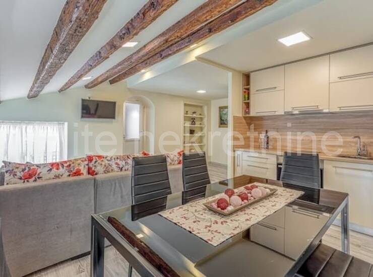 Ovaj predivan apartman nalazi se u prvom redu do mora, na trećem katu uređenog objekta. Ukupne je površine 48 m² i sastoji se od prostranog dnevnog boravka, kuhinje s blagovaonicom, jedne spavaće sobe i kupaonice.