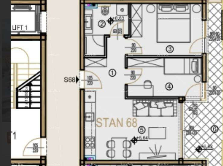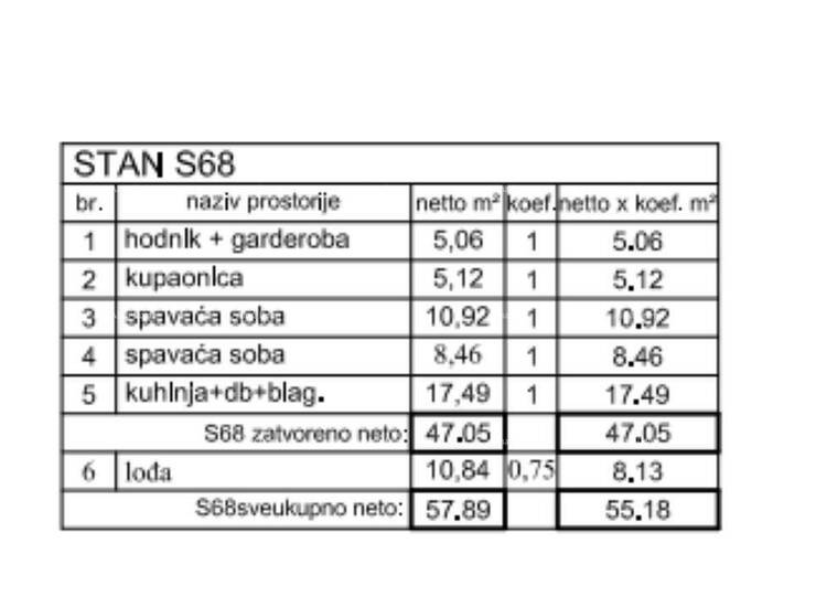 Stan S68 nalazi se na drugom katu i sastoji se od hodnika s garderobom, kupaonice, 2 spavaće sobe, dnevnog boravka s kuhinjom i blagovaonicom te loggie.