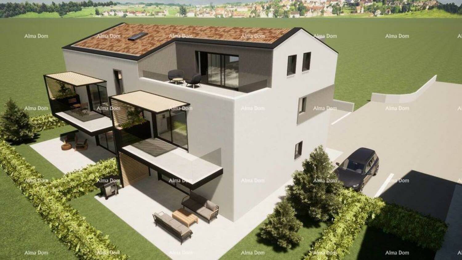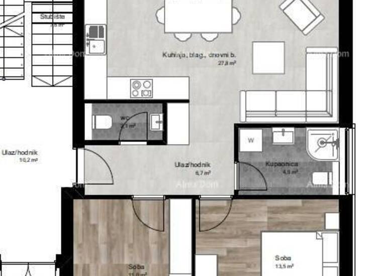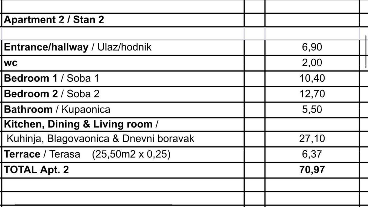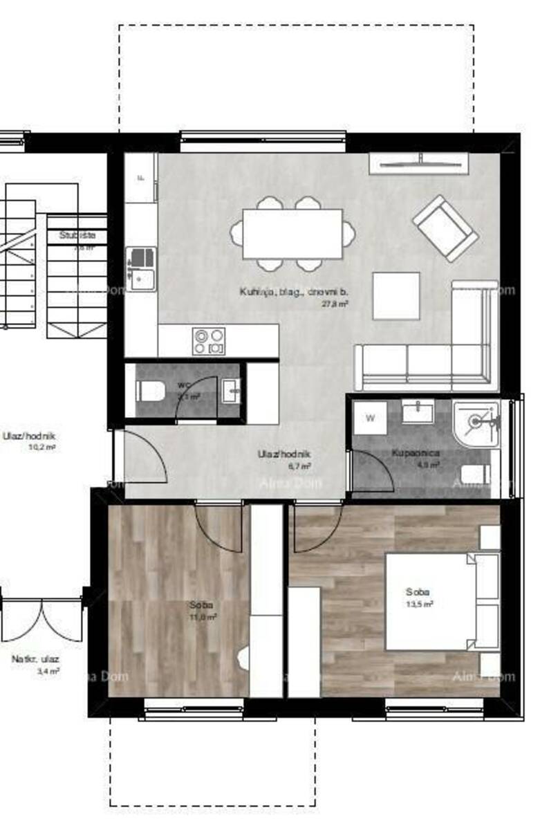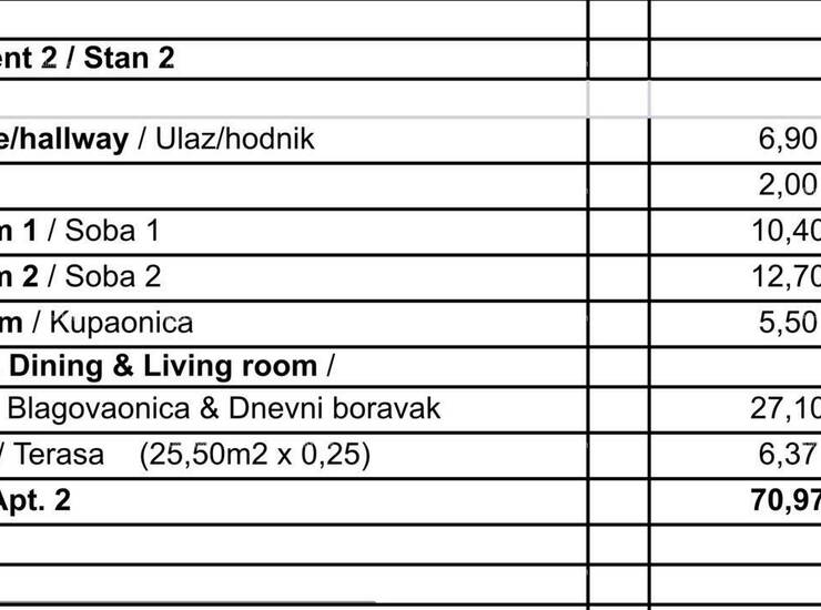 Stan se sastoji od ulaznog hodnika, dnevnog boravka+kuhinja+blagovaona, 2 spavaće sobe, kupaonice, WC i terase.