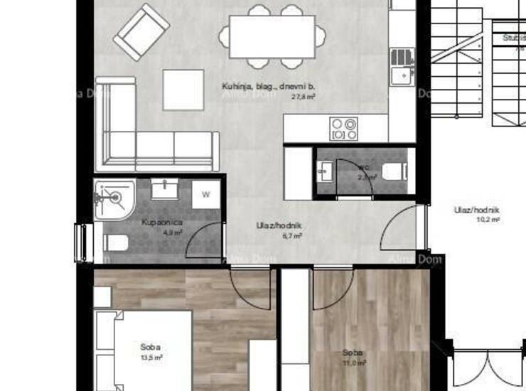Stan se sastoji od ulaznog hodnika, dnevnog boravka+kuhinja+blagovaona, 2 spavaće sobe, kupaonice, WC i terase.