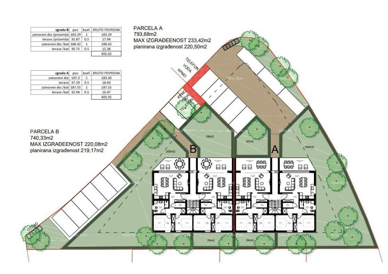 Svi stanovi imaju pripadajuću terasu s lijepim pogledom na prirodu i borovu šumu.