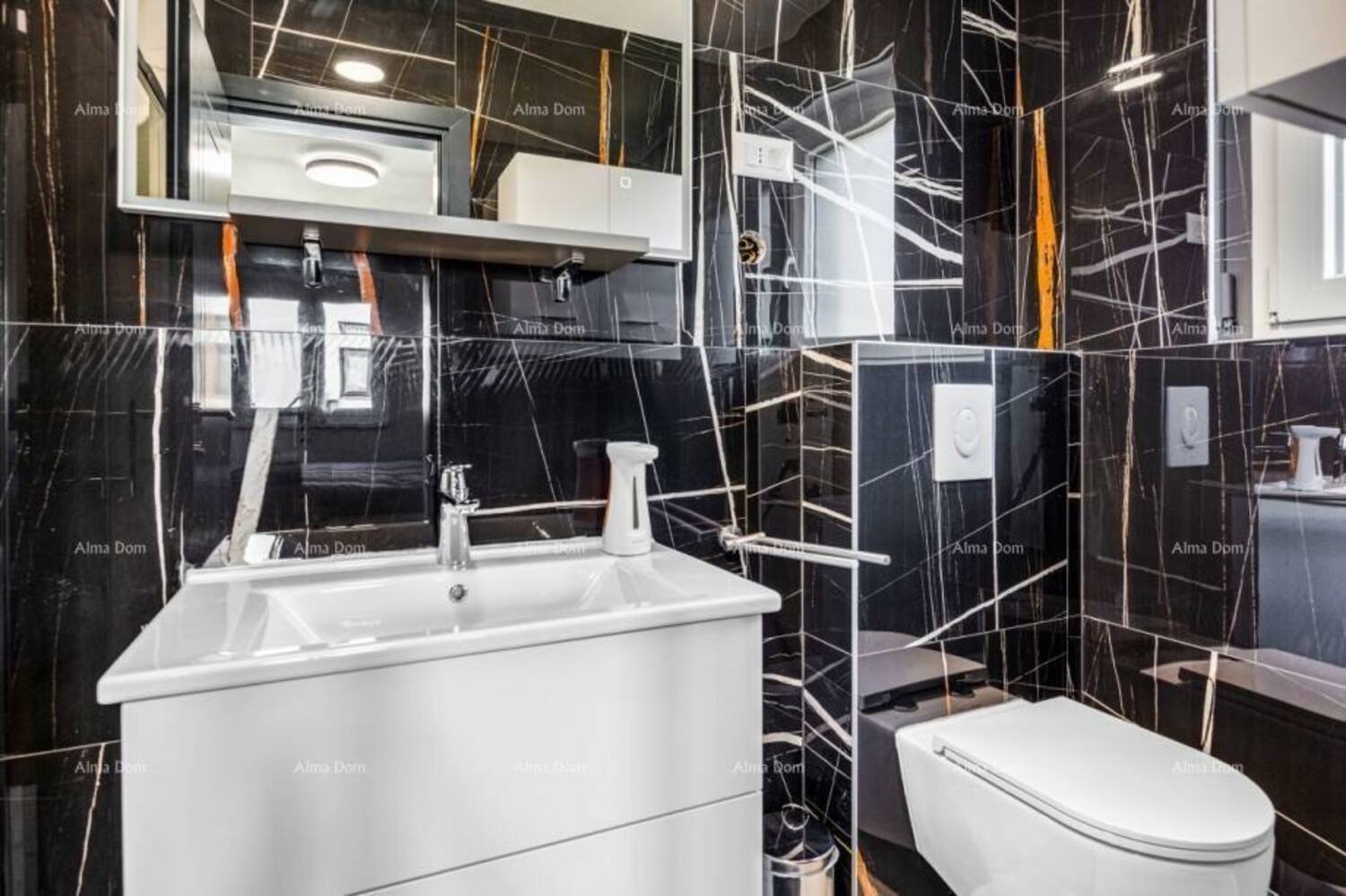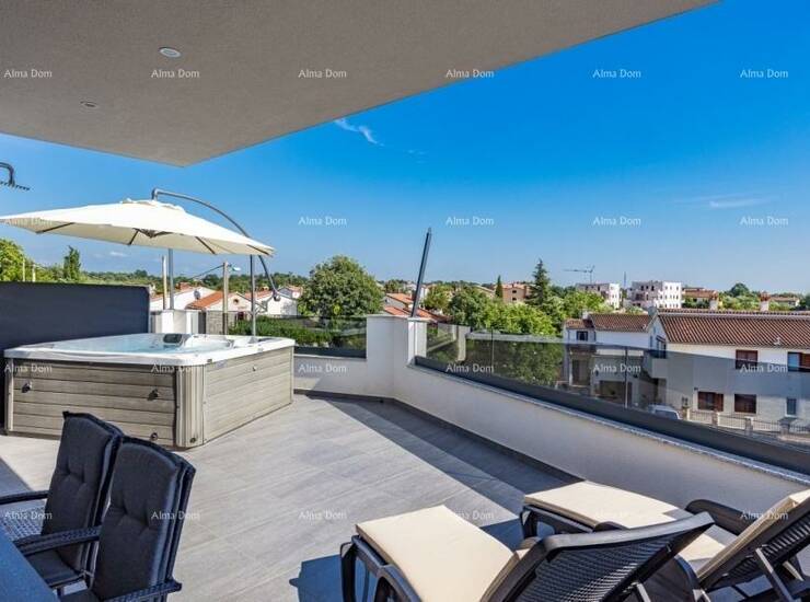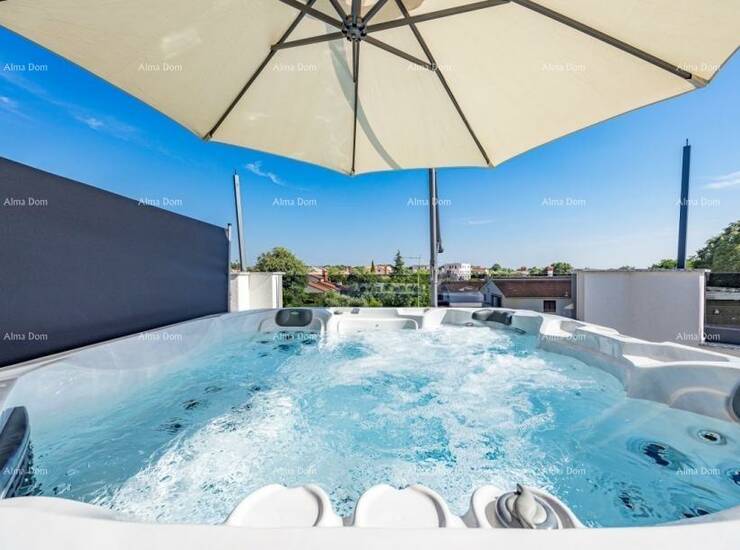 Stan se nalazi na 1. katu zgrade i sastoji se od hodnika, dnevnog boravka sa kuhinjom i blagavaonom, 2 spavaće sobe, 2 kupaone i velike terase. jedna kupaona posjeduje saunu, dok se na terasi nalazi jacuzzi.