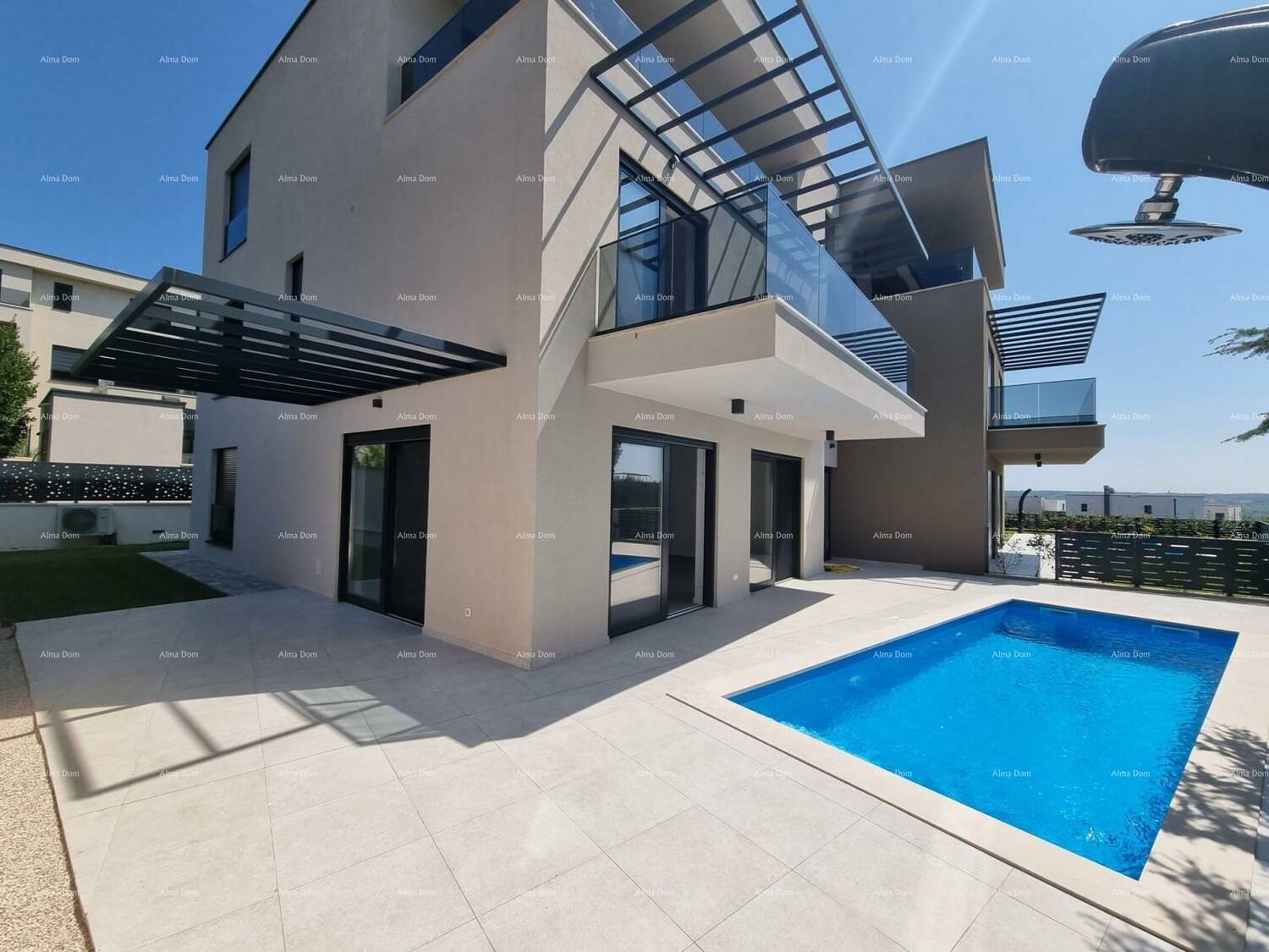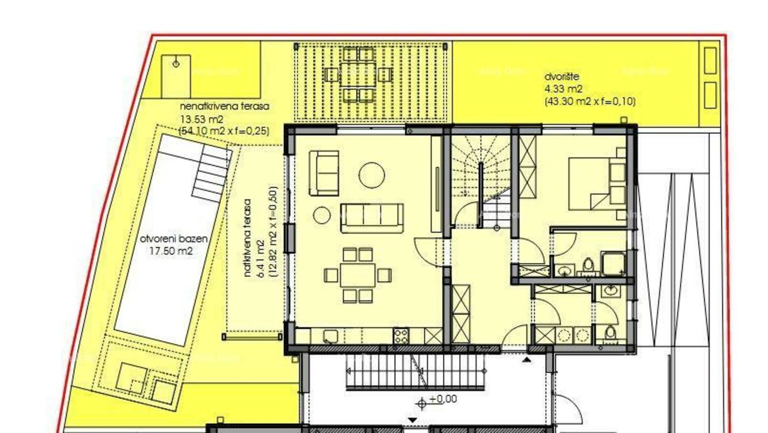 Dinji dio stana je okružen terasom i dvorištem u kojem se nalazi otvoreni bazen, te solarni tuš.
