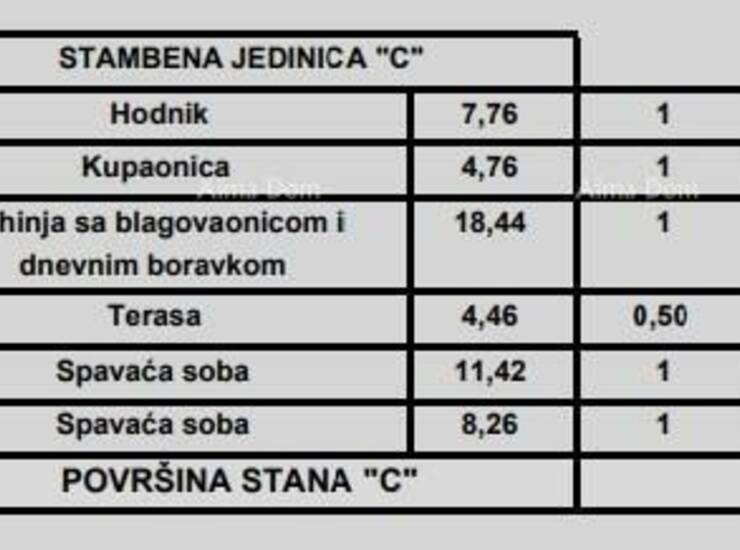 Stan C, sastoji se od ulaznog hodnika, dnevnog boravka s kuhinjom i blagavaonom, 2 spavaće sobe, kupaone i terase.