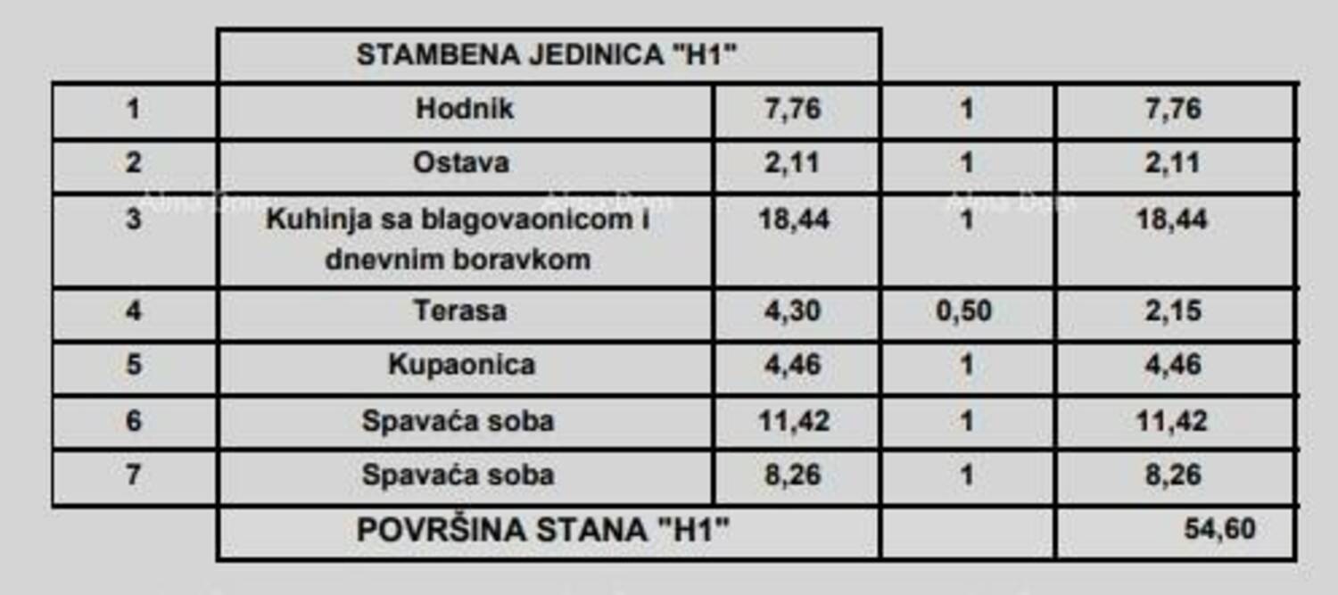Stan H1, sastoji se od ulaznog hodnika, dnevnog boravka s kuhinjom i blagovaonom, 2 spavaće sobe, kupaone, ostave i terase.