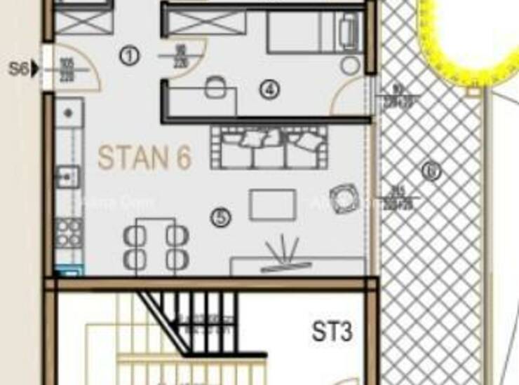 Stan S6 nalazi se na prvom katu zgrade i sastoji se od hodnika, dvije spavaće sobe, dnevnog boravka s kuhinjom i blagovaonicom te kupaonice.