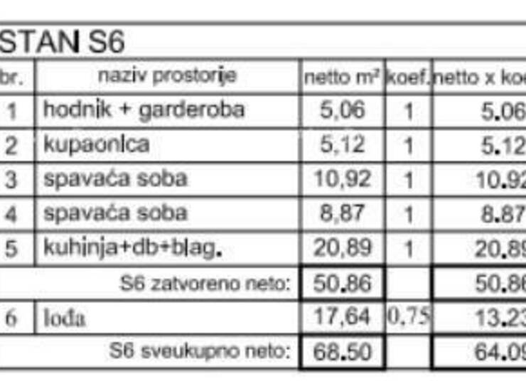 Ukupna neto površina stana iznosi 68,50 m² (stambeni dio 64,09 m²).