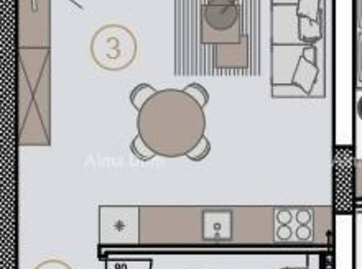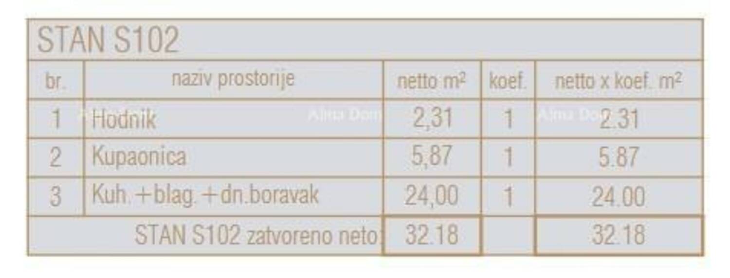 Garsonijera S102 sastoji se od hodnika, dnevnog boravka s kuhinjom i blagovaonicom, te kupaonice.