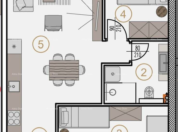 Hodnik+garderoba, kuhinje+blagovaonice+dnevnog boravaka, kupaonice i 2 spavaće sobe.
