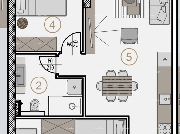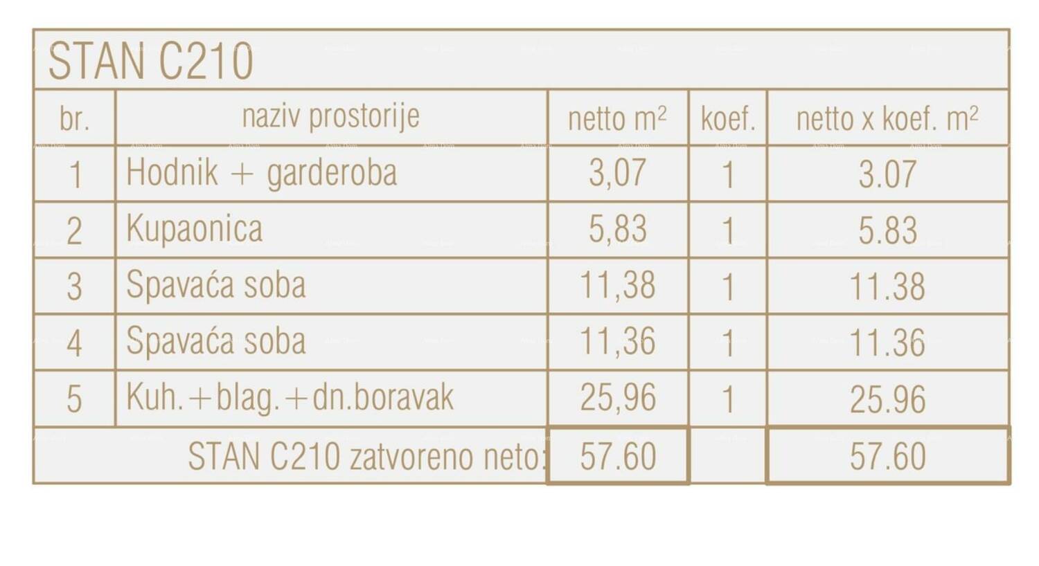 Stan C210, nalazi se na drugom katu centralne zgrade i sastoji se od: hodnika + garderobe, dnevnog boravaka, sa kuhinjom i blagovaonicom, 2 spavaće sobe i kupaonice.