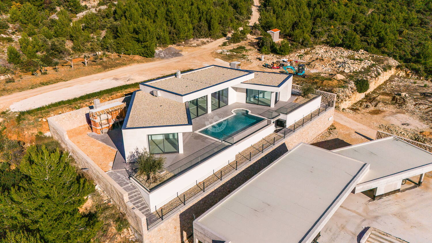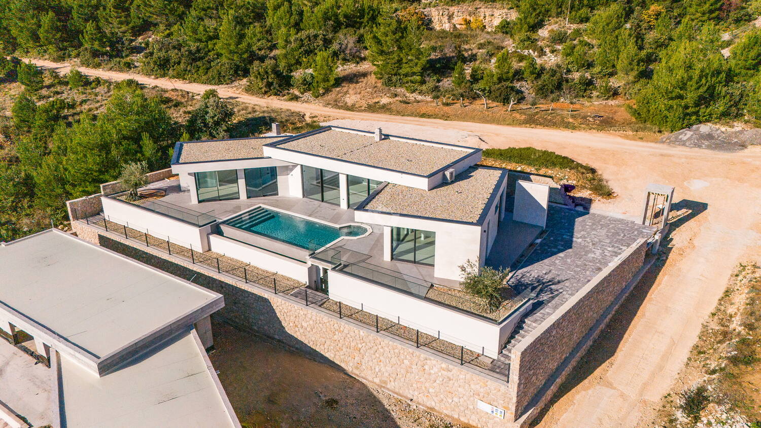Ova ekskluzivna vila oduševljava modernom arhitekturom, visokokvalitetnim materijalima i spektakularnim grijanim infinity bazenom. Okružena kamenim zidom, pruža maksimalnu privatnost i vrhunski komfor. Svaka soba ima vlastitu kupaonicu, što ovu nekretninu čini idealnom za obitelji i zahtjevne kupce.