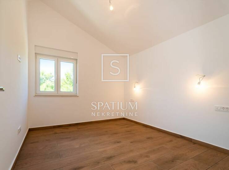 POSEDARJE, u ponudu smo dobili stan u novoizgrađenoj kući s ukupno dvije stambene jedinice, svaka čini jednu etažu. Predmetni stan nalazi se na prvom katu i sastoji se od stubišta, ulaza, hodnika, kupaonice, dvije spavaće sobe, dnevnog boravka, lođe i terase. Ukupna stambena površina iznosi 75,85 m2. Pripadaju mu dva parkirna mjesta od po 12 m2, dvorište (36,76 m2) te dva dijela vrta (7 m2 i 3 m2). Ukupna površina stana sa svim pripadajućim površinama s koeficijentima iznosi 98,18 m2. Kuća je izgrađena od visoko kvalitetnih materijala, postavljena je termo fasada s prirodnim fasadnim kamenom, PVC stolarija s električnim podizačima roleta i komarnicima, multi split klima uređaji te vrhunska keramika i sanitarije u kupaonici. Nekretnina se nalazi na veoma mirnom mjestu, s pogledom na zelenilo i more, a udaljena je od prve pješčane plaže samo 500 m. Odlična prilika za investiciju u svrhu turizma ili kao opcija za život obitelji. Za napomenuti je da je cijela kuća trenutno u fazi etažiranja te će po projektu stanu pripasti navedeni parking i okućnica, a bit će uvedeno u vlasnički list.