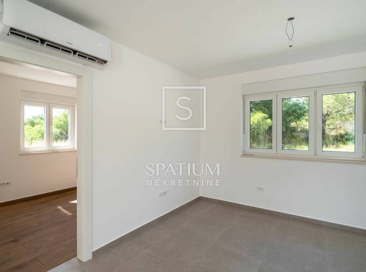 POSEDARJE, u ponudu smo dobili stan u novoizgrađenoj kući s ukupno dvije stambene jedinice, svaka čini jednu etažu. Predmetni stan nalazi se u prizemlju i sastoji se od ulaza, predsoblja, kupaonice, dvije spavaće sobe, dnevnog boravka, lođe i terase. Ukupna stambena površina iznosi 69,28 m2. Stanu pripadaju dva parkirna mjesta od po 12 m2, dvorište (53,76 m2) te dva dijela vrta (32,60 m2 i 16,40 m2). Ukupna površina stana sa svim pripadajućim površinama s koeficijentima iznosi 92,12 m2. Izgrađena je od visoko kvalitetnih materijala, postavljena je termo fasada s prirodnim fasadnim kamenom, PVC stolarija s električnim podizačima roleta i komarnicima, multi split klima uređaji te vrhunska keramika i sanitarije u kupaonici. Nekretnina se nalazi na veoma mirnom mjestu s pogledom na zelenilo i more, a udaljena je od prve pješčane plaže samo 500 m. Odlična prilika za investiciju u svrhu turizma ili kao opcija za život obitelji. Za napomenuti je da je cijela kuća trenutno u fazi etažiranja te će po projektu stanu pripasti navedeni parking i okućnica, a bit će uvedeno u vlasnički list.
