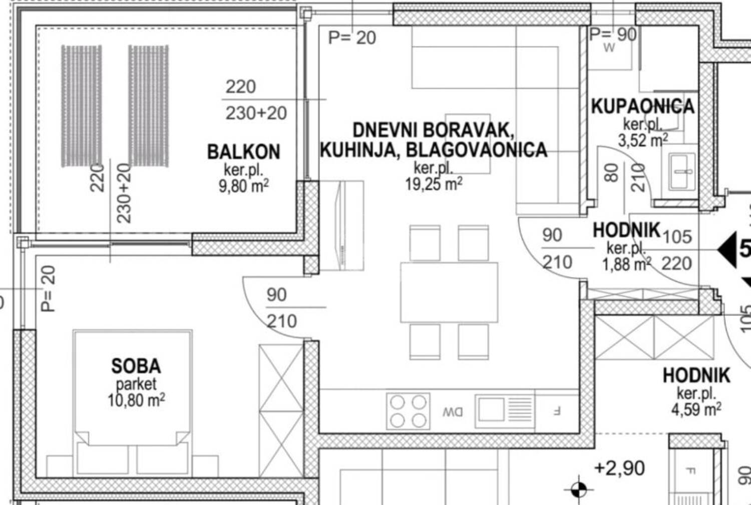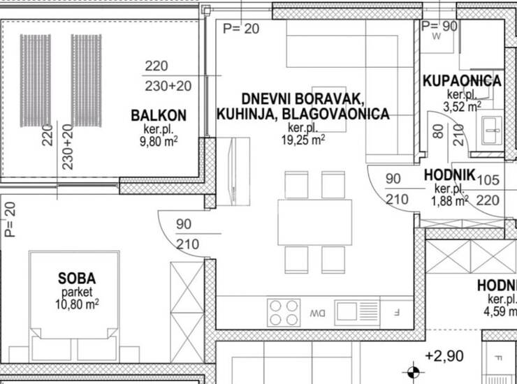 dnevnog boravka/blagovaone/kuhinje:19,25 m2