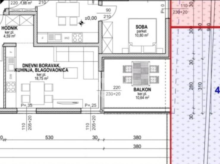 dnevnog boravka/blagovaone/kuhinje:18,75m2
