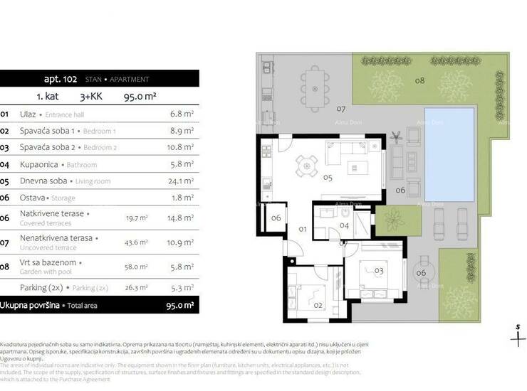 Stan oznake 102, površine 109.3 m2, nalazi se u prizemlju zgrade i sastoji od ulaznog hodnika, kupaonice, ostave, open space dnevnog boravka s kuhinjom i blagovaonom, nenatkrivene terase na koju se nastavlja vrt i bazen i još jedne natkrivene terase.