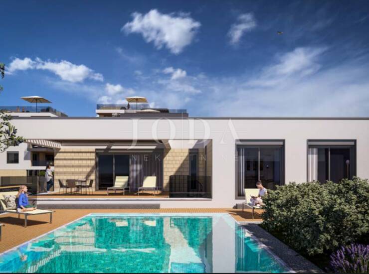 Prizemlje uključuje ulazni hodnik, prostran dnevni boravak s blagovaonicom i potpuno opremljenu kuhinju u otvorenom konceptu, tri spavaće sobe, dvije kupaonice, gostinjski toalet i tehničku sobu. Vanjski prostor nudi natkrivenu i dvije nenatkrivene terase, ograđeni vrt, privatni bazen sa sunčalištem te ljetnu kuhinju – savršeno mjesto za opuštanje i druženje.