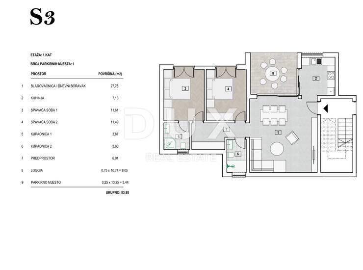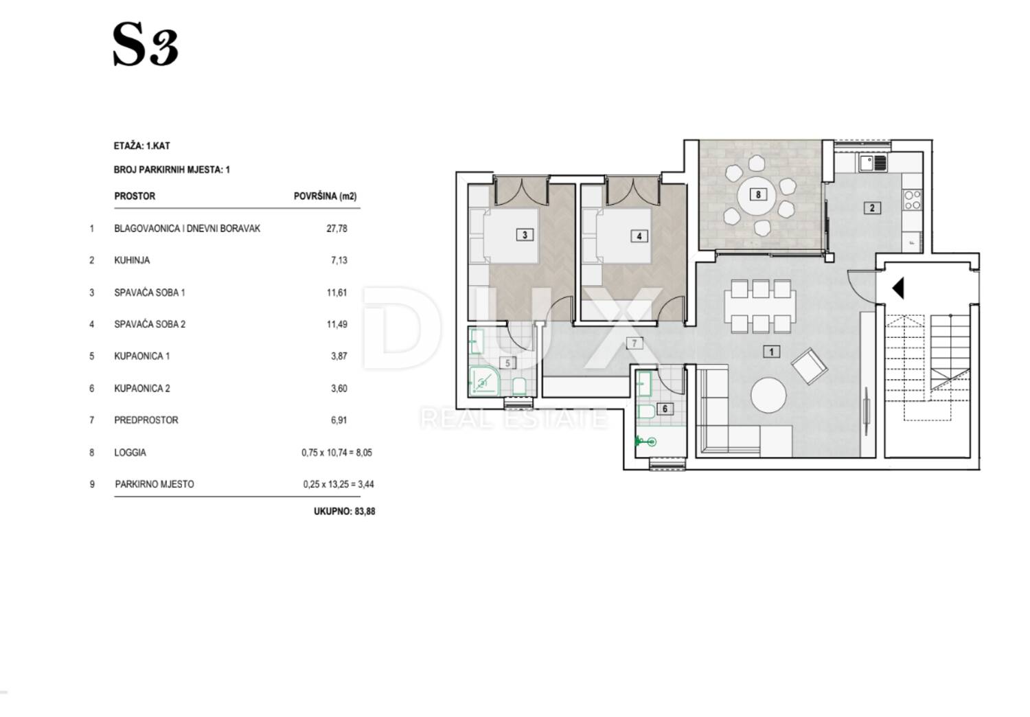 Stan u novogradnji površine 83,88 m2 predstavlja savršen spoj udobnosti, praktičnosti i estetike. Stan se nalazi u prizemlju stambene zgradi s ukupno osam stanova , pružajući mirno i privatno okruženje za svoje stanare.