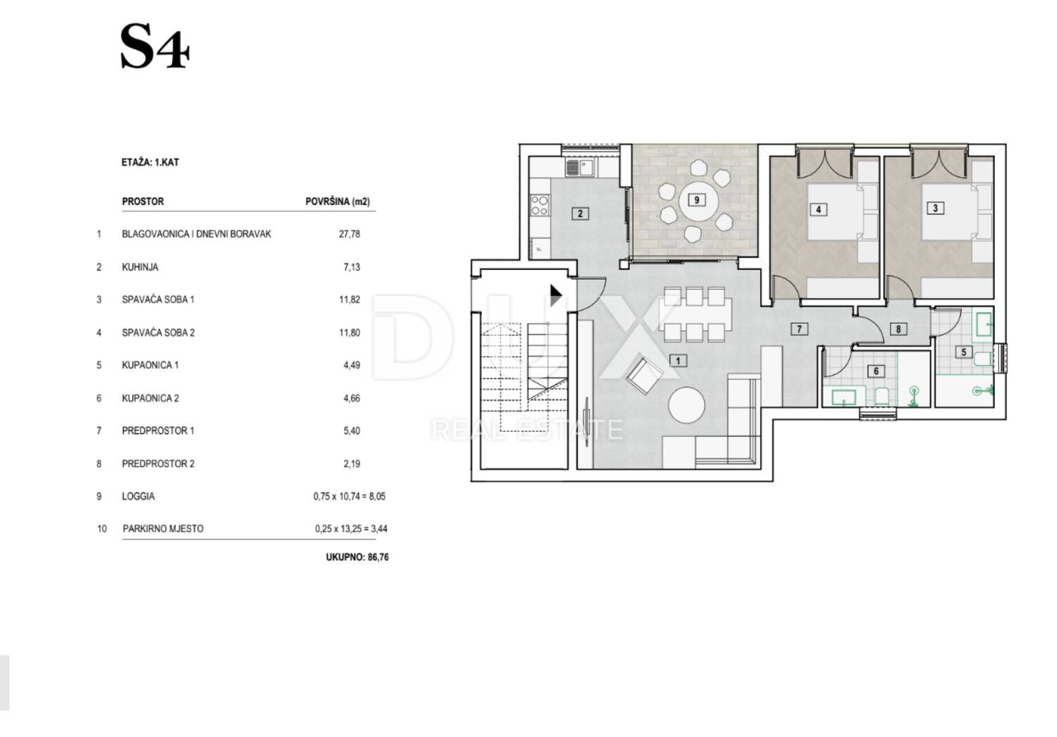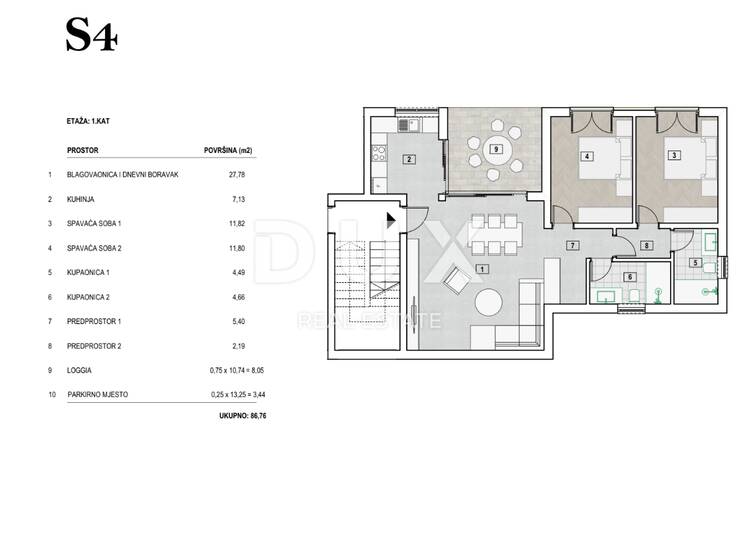 Stan u novogradnji površine 86,76 m2 predstavlja savršen spoj udobnosti, praktičnosti i estetike. Stan se nalazi na drugom katu stambene zgradi s ukupno osam stanova , pružajući mirno i privatno okruženje za svoje stanare.