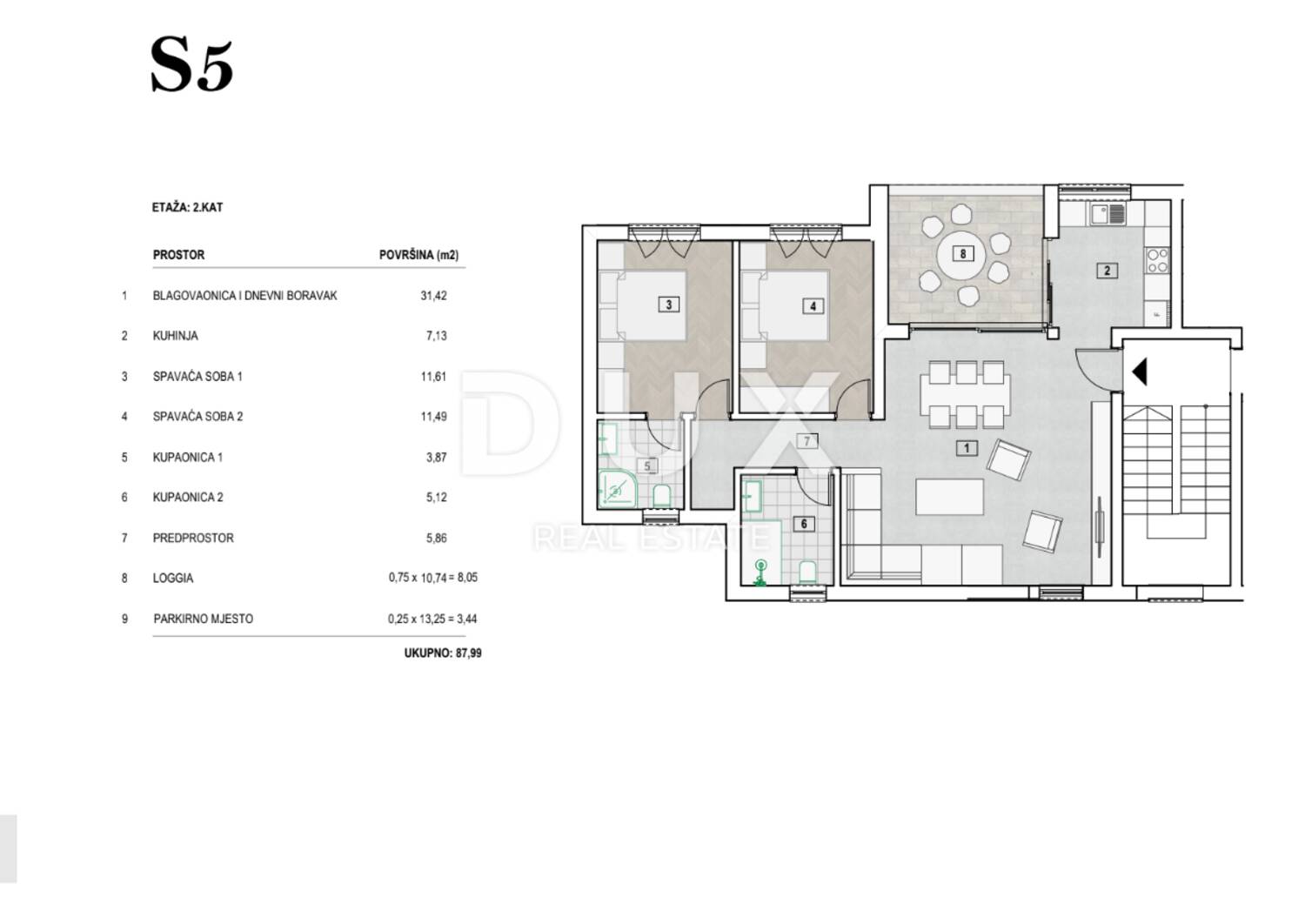 Stan u novogradnji površine 87,99 m2 predstavlja savršen spoj udobnosti, praktičnosti i estetike. Stan se nalazi na drugom katu stambene zgradi s ukupno osam stanova , pružajući mirno i privatno okruženje za svoje stanare.