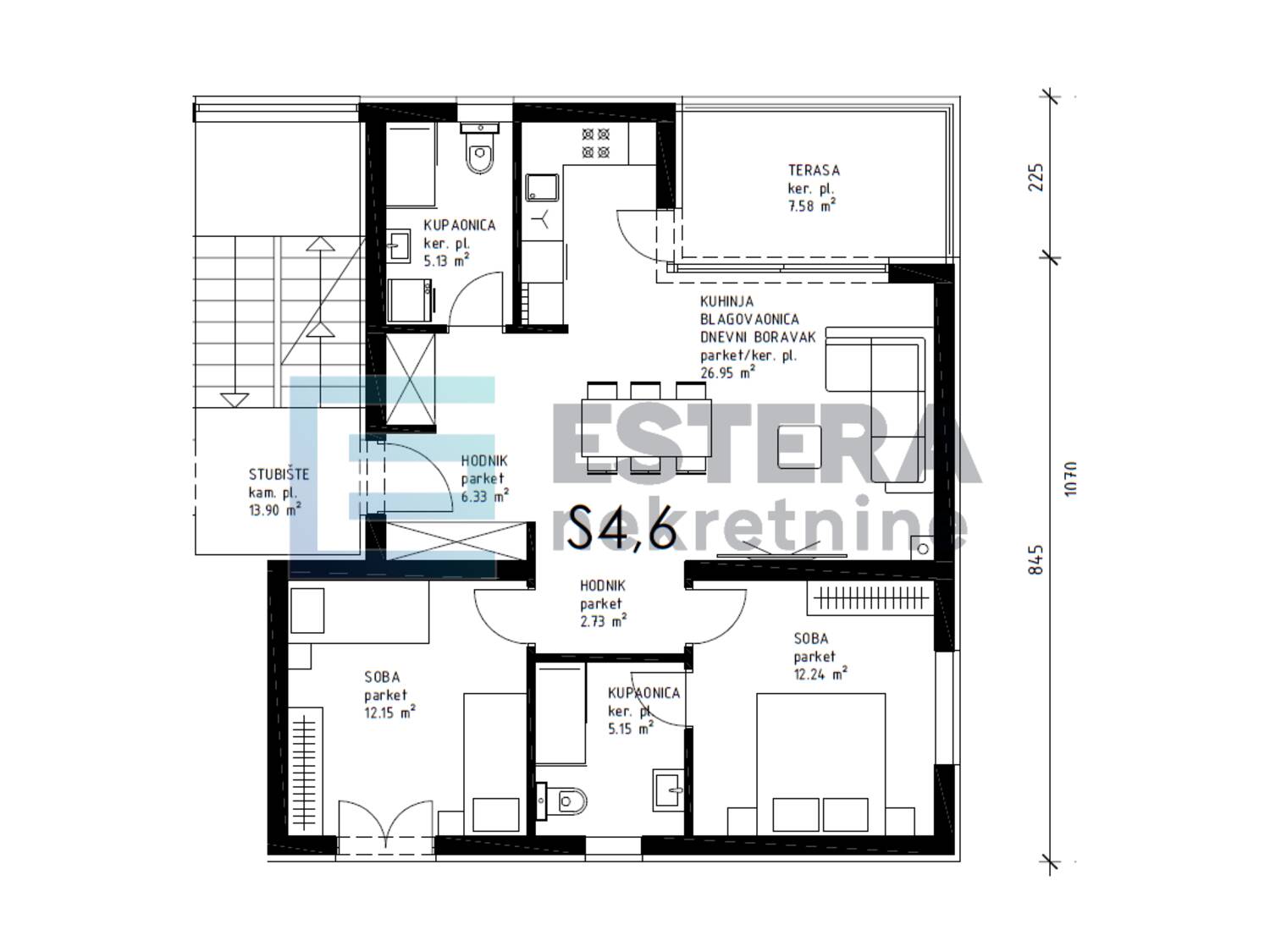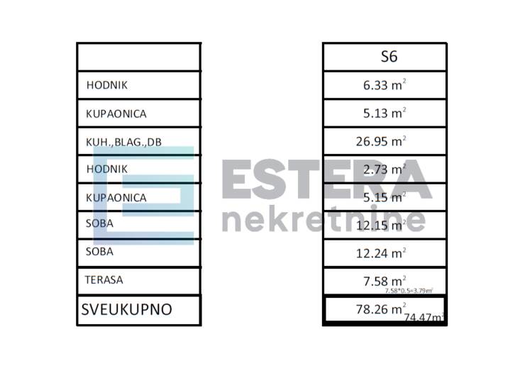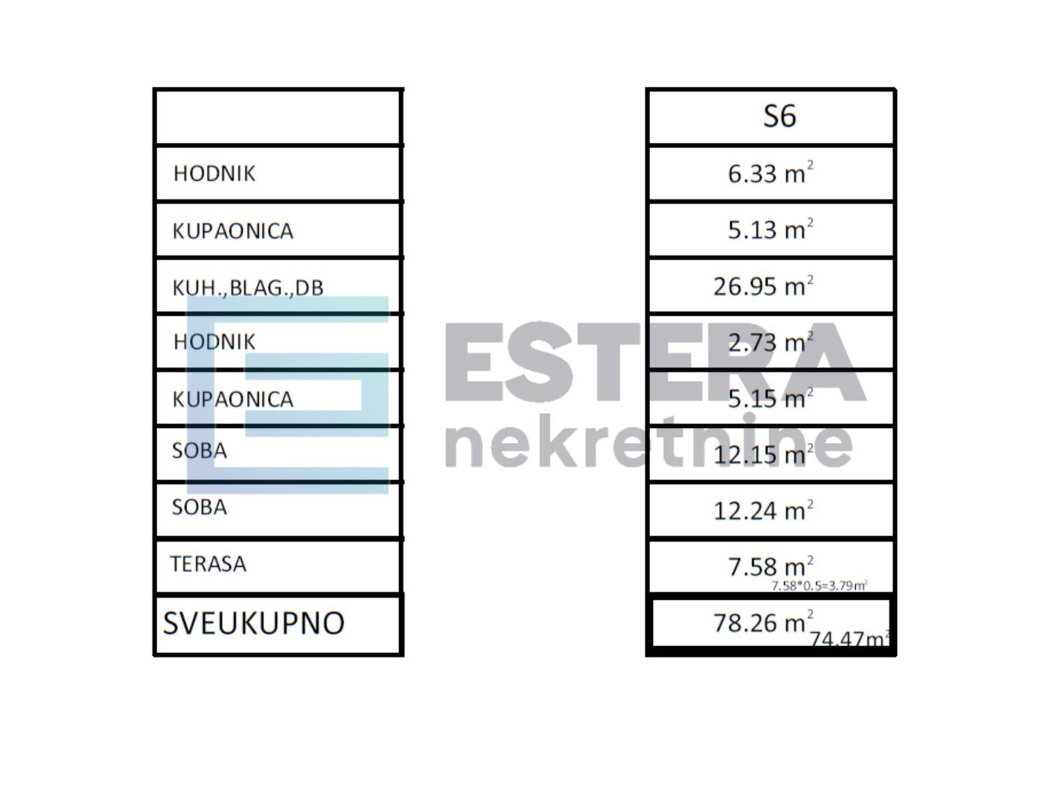 Prodaje se moderni trosobni stan (S6), ukupne površine 74,47 m2, na drugom katu manje stambene zgrade s ukupno 6 stanova.