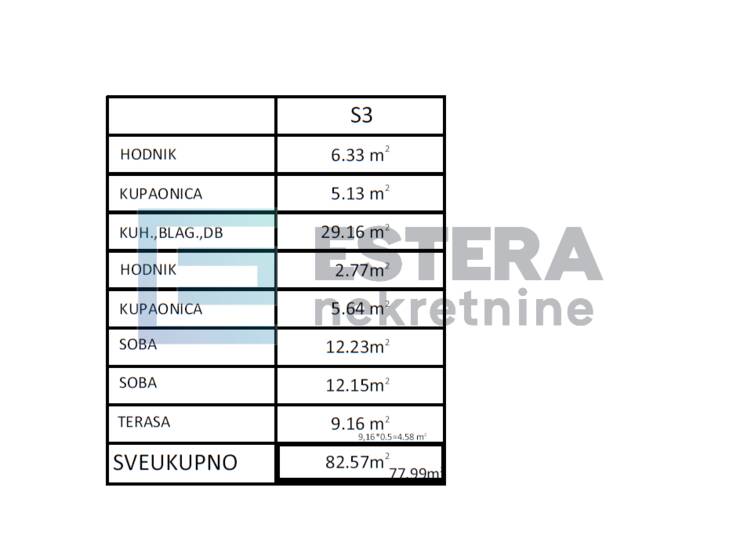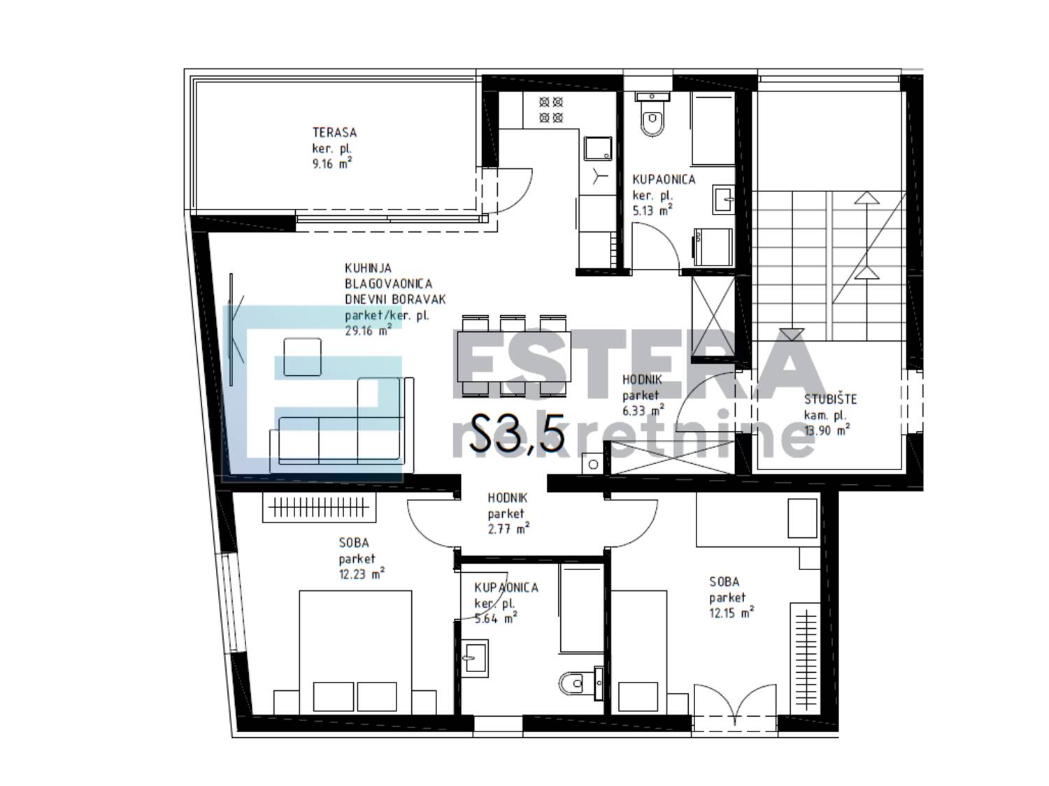 Prodaje se moderni trosobni stan (S3), ukupne površine 77,99 m2, na drugom katu manje stambene zgrade s ukupno 6 stanova.