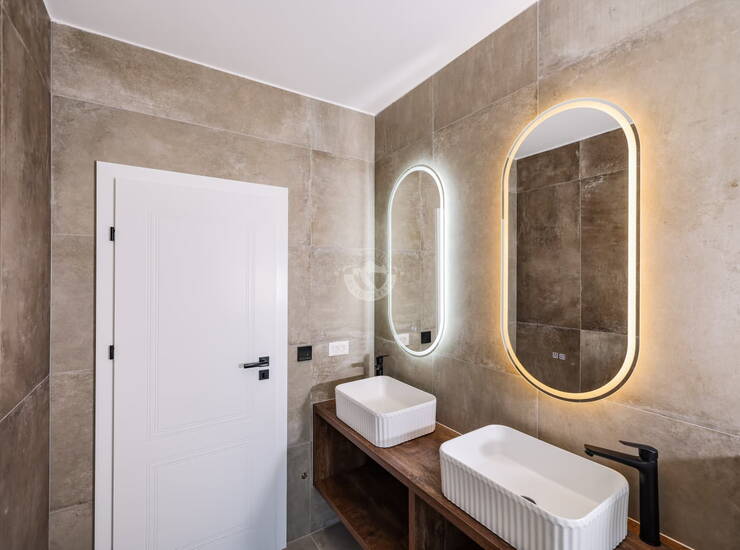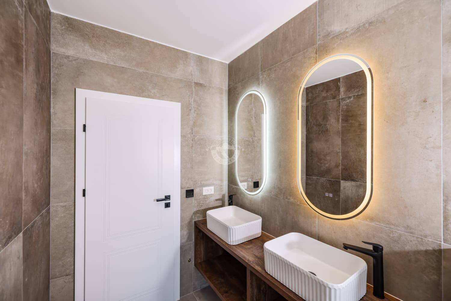 Stan impresionira prostranim rasporedom, modernom opremom i velikom natkrivenom terasom, savršenom za opušteno stanovanje u blizini mora.