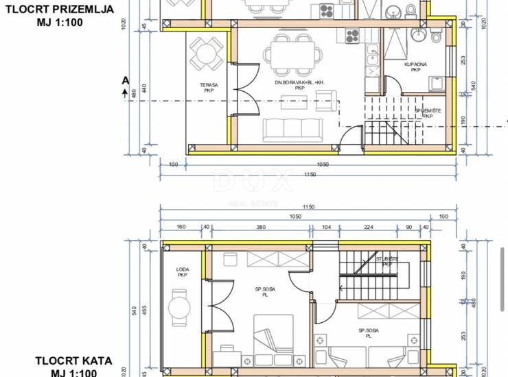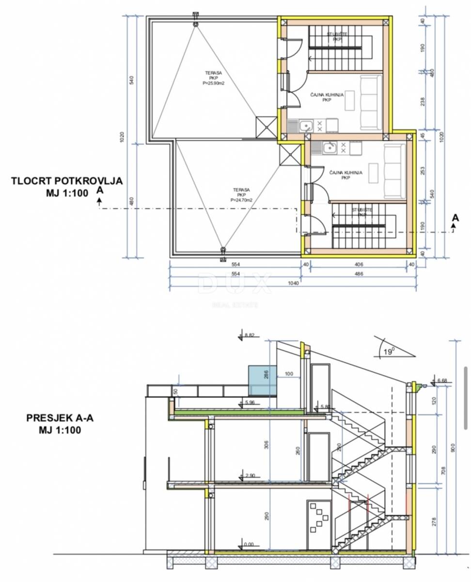 U prizemlju stana nalazi se prostrani dnevni boravak s kuhinjom i blagovaonicom, kupaonica te izlaz na terasu. Na katu su smještene dvije spavaće sobe, kupaonica i lođa. U potkrovlju se nalazi čajna kuhinja te velika terasa površine 25 m².