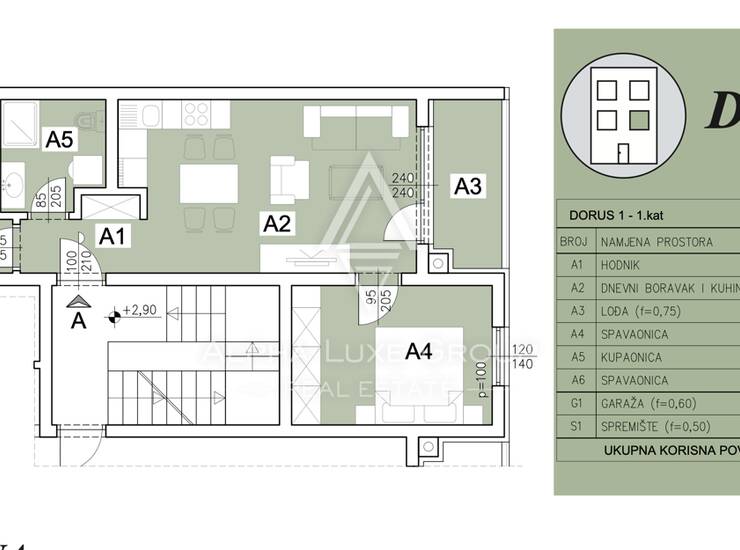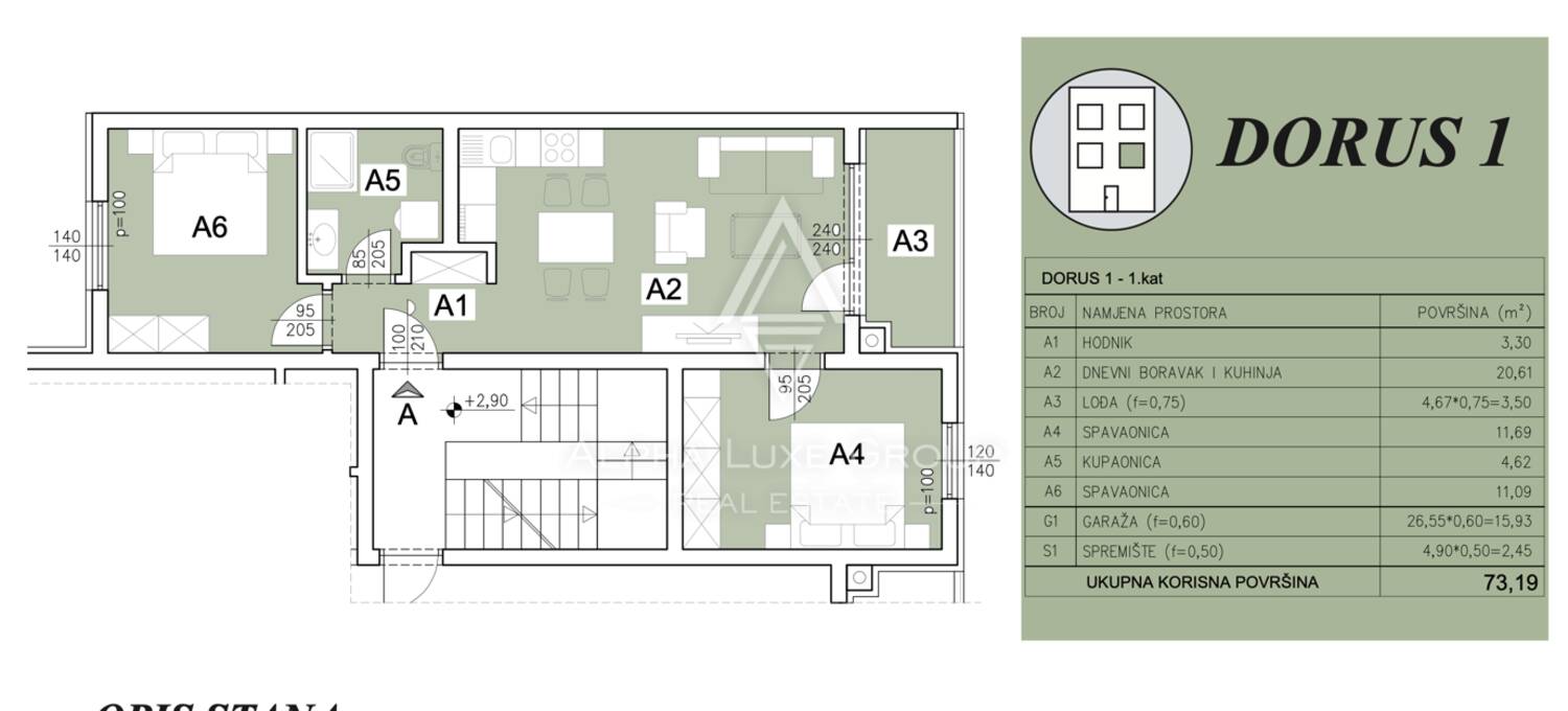 Dobro osmišljen stan smješten na prvom katu moderne stambene zgrade nudi ukupnu neto površinu od 73,19 m², uključujući stambeni prostor, ugodnu lođu, garažno parkirno mjesto i spremište.